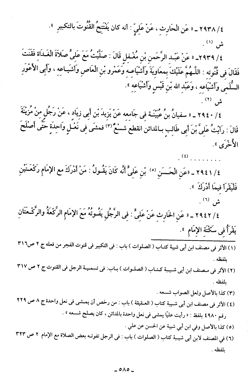 4/ 2939 - "عَنْ عَبْدِ الرَّحَمنِ بْنِ مُغْفِلٍ قَالَ: صَلَّيْتُ مَعَ عَلِىٍّ صَلَاةَ الْغَدَاةِ فَقَنَتَ فَقَالَ فِى قُنُوتِهِ: اللَّهُمَّ عَلَيْكَ بِمعَاوِيَةَ وَأَشْيَاعِهِ وَعَمْرو بْنِ الْعَاصِ وَأشَياعِهِ، وَأَبِى الأَعْوَرِ السُّلَمِى وَأَشْيَاعِهِ، وَعَبْدِ الله بْنِ قَيْسٍ وَأشْيَاعِهِ".