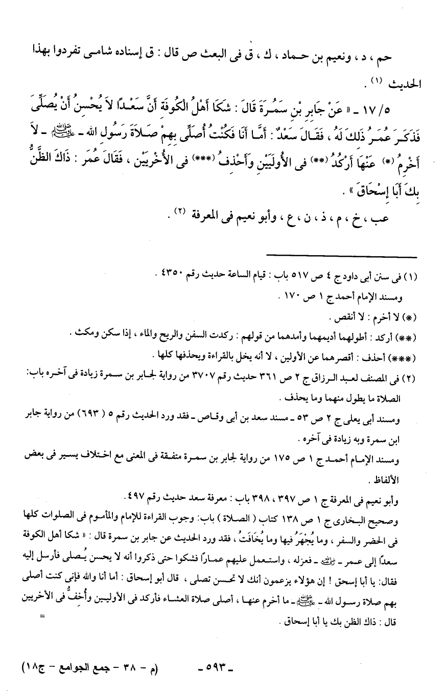 5/ 17 - "عَنْ جَابِرِ بْنِ سَمُرَةَ قَالَ: شَكَا أَهْلُ الْكُوفَةِ أَنَّ سَعْدًا لَا يُحْسِنُ أَنْ يُصَلِّىَ فَذَكَرَ عُمَرُ ذَلِكَ لَهُ، فَقَالَ سَعْدٌ: أَمَّا أَنَا فَكُنْتُ أُصَلِّى بِهِمْ صَلَاةَ رَسُولِ الله - صلى الله عليه وسلم - لَا أَخْرِمُ (*) عَنْهَا أَرْكُدُ (* *) في الأُولَيَيْنِ وَأَحْذِفُ (* * *) في الأُخْريَيْن، فَقَالَ عُمَر: ذَاكَ الظَّنُّ بِكَ أَبَا إِسْحَاقَ".