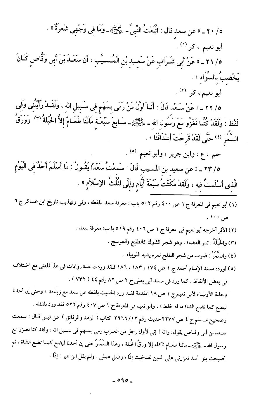 5/ 22 - "عَنْ سَعْدٍ قَالَ: أَنَا أوَّلُ مَنْ رَمَى بِسَهْمٍ فِى سَبِيلِ الله، وَلَقَدْ رَأَيْتُنِى وَفِى لَفْظٍ: وَلَقَدْ كُنَّا نَغْزُو مَعَ رَسُولِ اللهِ - صلى الله عليه وسلم - سَابعَ سَبْعَةٍ مَا لَنَا طَعَامٌ إِلَّا الحُبْلةُ (¬3) وَوَرَقُ السَّمُرِ (¬4) حَتَّى لَقَدْ قَرِحَتْ أَشْدَاقُنَا".
