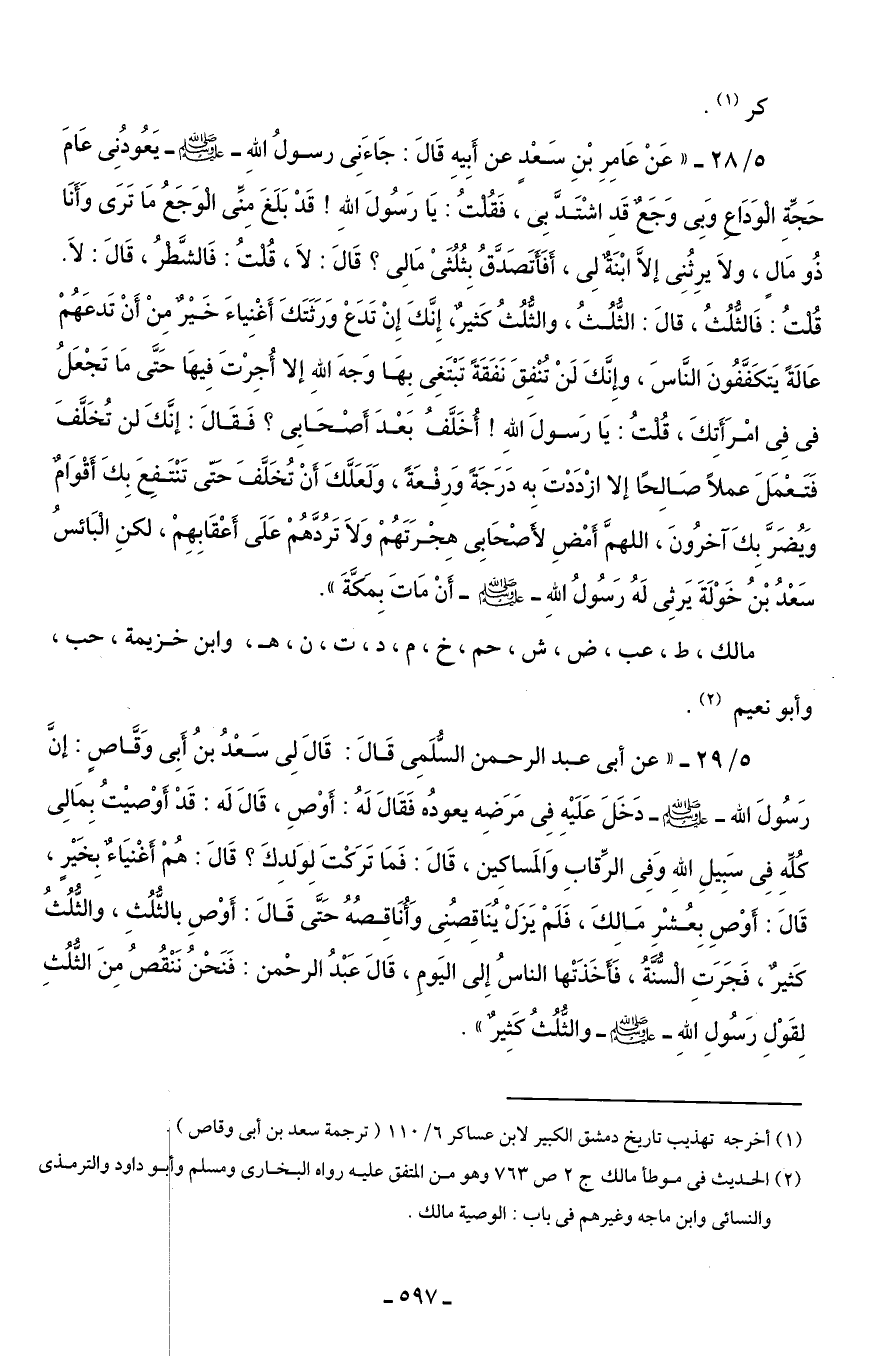 5/ 29 - "عن أبى عبد الرحمن السُّلَمِى قَالَ: قَالَ لِى سَعْدُ بنُ أَبِى وَقَّاصٍ: إنَّ رَسُولَ الله - صلى الله عليه وسلم - دَخَلَ عَلَيْهِ فِى مَرَضِه يعودُه فَقَالَ لَهُ: أَوْصِ، قَالَ لَه: قَدْ أَوْصيْتُ بِمَالِى كُلَّهِ فِى سَبِيلِ اللهِ وَفِى الرِّقابِ وَالمَساكِين، قَالَ: فَمَا تَرَكْتَ لِوَلدِكَ؟ قَالَ: هُمْ أَغْنيَاءٌ بِخَيْرٍ، قَالَ: أَوْصِ بِعُشْرِ مَالِكَ، فَلَمْ يَزَلْ يُنَاقِصُنِى وَأُنَاقِصُهُ حَتَّى قَالَ: أَوْصِ بالثُّلُثِ، والثُّلُثُ كَثيرٌ، فَجَرَتِ السُّنَّةُ، فَأَخَذَتْها الناسُ إِلى اليَومِ، قَالَ عَبْدُ الرحْمن: فَنَحْنُ نَنْقُصُ مِنَ الثُّلُثِ لِقَوْلِ رَسُولِ اللهِ - صلى الله عليه وسلم - والثُّلُثُ كَثِيرٌ".