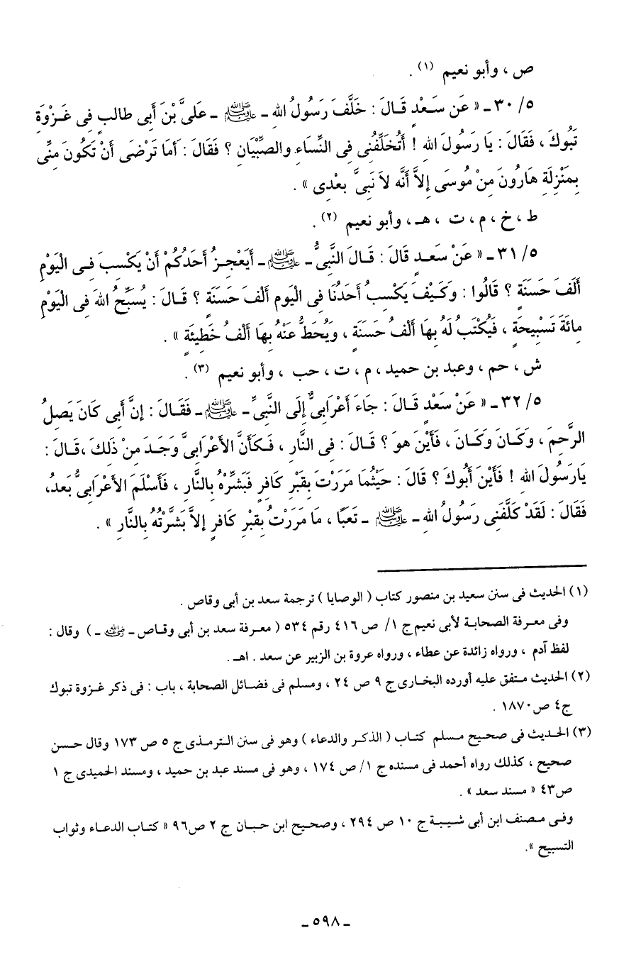 5/ 32 - "عَنْ سَعْدٍ قَالَ: جَاءَ أَعْرَابِىٌّ إِلَى النَّبِىَّ - صلى الله عليه وسلم - فَقَالَ: إنَّ أَبِى كان يَصِلُ الرَّحِمَ، وَكَانَ وَكَانَ، فَأَيْنَ هوَ؟ قَالَ: فِى النَّارِ، فَكَأَنَّ الأَعْرَابِىَّ وَجَدَ مِنْ ذَلِكَ، قَالَ: يَا رَسُولَ اللهِ! فَأَيْنَ أبُوكَ؟ قَالَ: حَيْثُمَا مَرَرْتَ بِقَبْرِ كَافِرٍ فَبَشِّرْهُ بِالنَّارِ، فَأَسْلَمَ الأَعْرَابِىُّ بَعدُ، فَقَالَ: لَقَدْ كلَّفَنِى رَسُولُ اللهِ - صلى الله عليه وسلم - تَعَبًا، مَا مَرَرْتُ بِقبْرِ كَافرٍ إلَّا بَشَّرْتُهُ بِالنَّارِ".