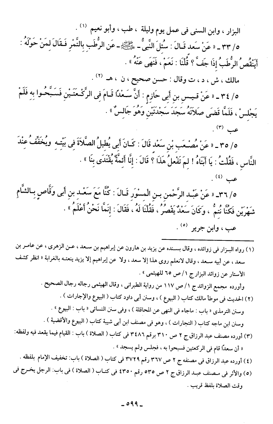 5/ 36 - "عَنْ عَبْدِ الرَّحْمنِ بنِ الْمِسْوَرِ قَالَ: كُنَّا مَعَ سَعْدِ بنِ أَبى وَقَّاصٍ بِالشَّامِ شَهْرَيْن فَكُنَّا نُتِمُّ، وَكانَ سَعْدٌ يَقْصُرُ، فَقُلْنَا لَهُ، فَقَالَ: إِنَمَّا نَحْنُ أَعْلَمُ".