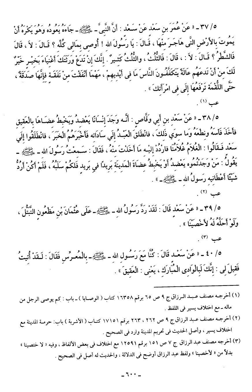 5/ 37 - "عَنْ عُمَرَ بنِ سَعْدٍ عَنْ سَعْدٍ: أَنَّ النَّبِىَّ - صلى الله عليه وسلم - جَاءَهُ يَعُودُه وَهُوَ يَكْرَهُ أَنْ يَمُوتَ بالأَرْضِ الَّتى هَاجَرَ مِنْهَا، قَالَ: يَا رَسُولَ اللهِ! أُوصِى بِمَالِى كُلِّهِ؟ قَالَ: لَا، قَالَ فَالشَّطْرُ؟ قَالَ: لَا: ، قَالَ: فَالثُّلُثُ، والثُّلُثُ كَثِيرٌ. إِنَّكَ إِنْ تَدَعْ وَرَثَتَكَ أَغْنِيَاءَ بِخَيْرٍ خَيْرٌ لَكَ مِنْ أنْ تَدعَهُم عَالَةً يَتَكَفَّفُونَ النَّاسَ مَا فِى أَيْدِيهِمْ، مَهْمَا أنْفَقْتَ مِنْ نَفَقَةٍ فَإِنَّهَا صَدَقَةٌ، حَتَّى اللُّقْمَة تَرْفَعُهَا إِلَى فِى امْرَأَتِكَ".