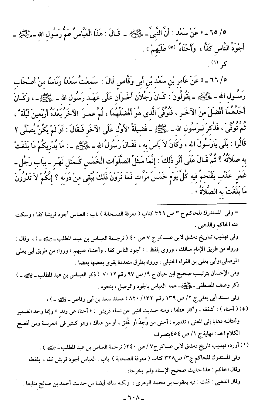 5/ 65 - "عَنْ سَعْدٍ: أَنَّ النَّبِىَّ - صلى الله عليه وسلم - قَالَ: هَذَا الْعَبَّاسُ عَمُّ رَسُولِ اللهِ - صلى الله عليه وسلم - أَجْوَدُ النَّاسِ كَفًّا، وَأَحْنَاهُ (*) عَلَيْهِمْ".
