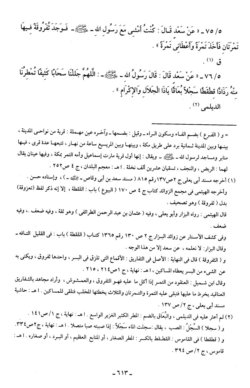 5/ 75 - "عَنْ سَعْدٍ قَالَ: كُنْتُ أَمْشِى مَعَ رَسُولِ اللهِ - صلى الله عليه وسلم - فَوَجَدَ ثُفْرُوقَةً فِيهَا تَمْرَتَانِ فَأَخَذَ تَمْرَةً وَأَعْطَانِى تَمْرَةً".