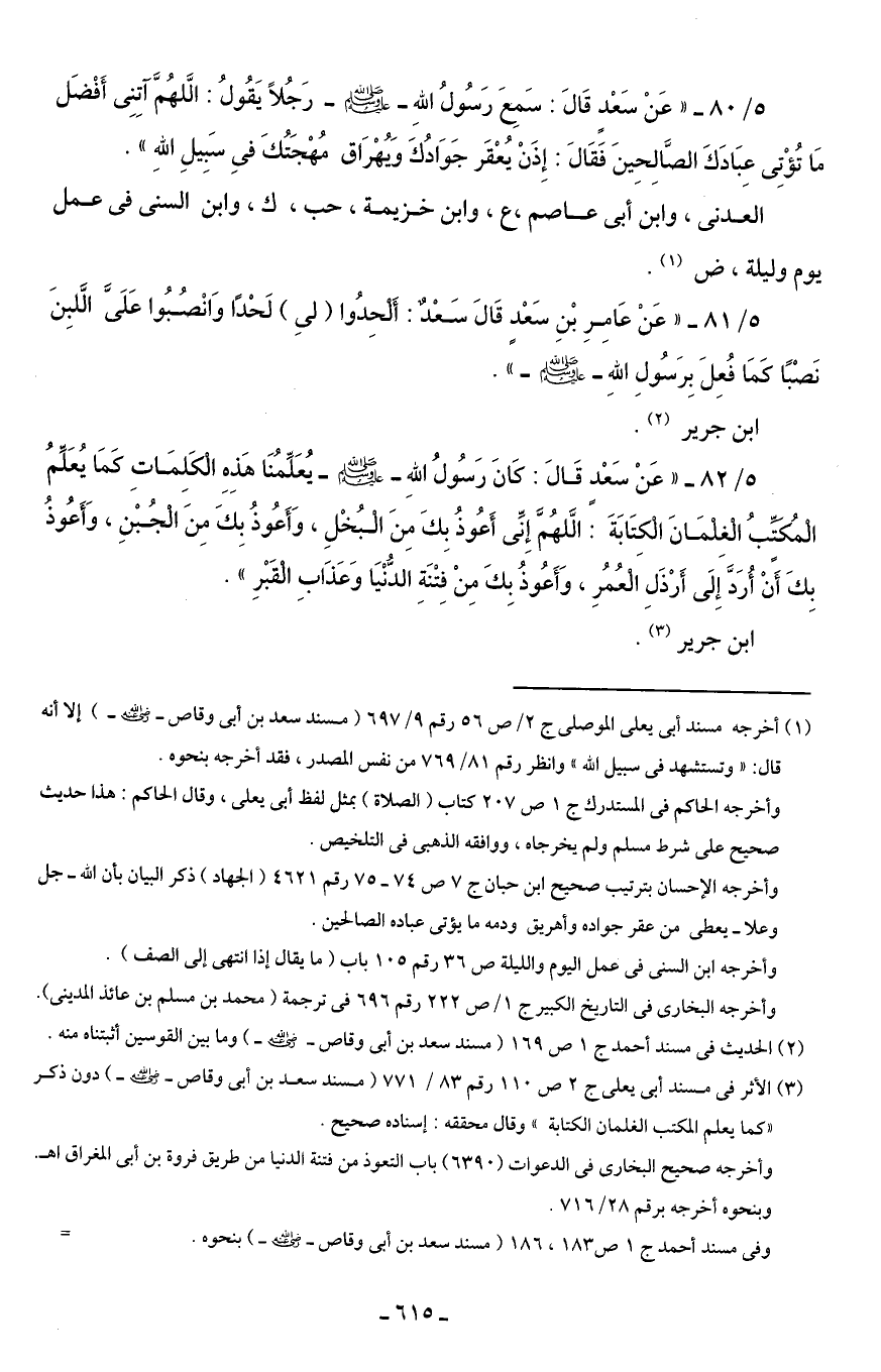 5/ 80 - "عَنْ سَعْدٍ قَالَ: سَمِعَ رَسُولُ اللهِ - صلى الله عليه وسلم - رَجُلًا يَقُولُ: الَّلهُمَّ آتِنِى أَفْضَل مَا تُؤْتِى عِبَادَكَ الصَّالِحِينَ فَقَالَ: إِذَنْ يُعْقَر جَوَادُكَ وَيُهْرَاق مُهْجَتُكَ فِى سَبِيلِ اللهِ".