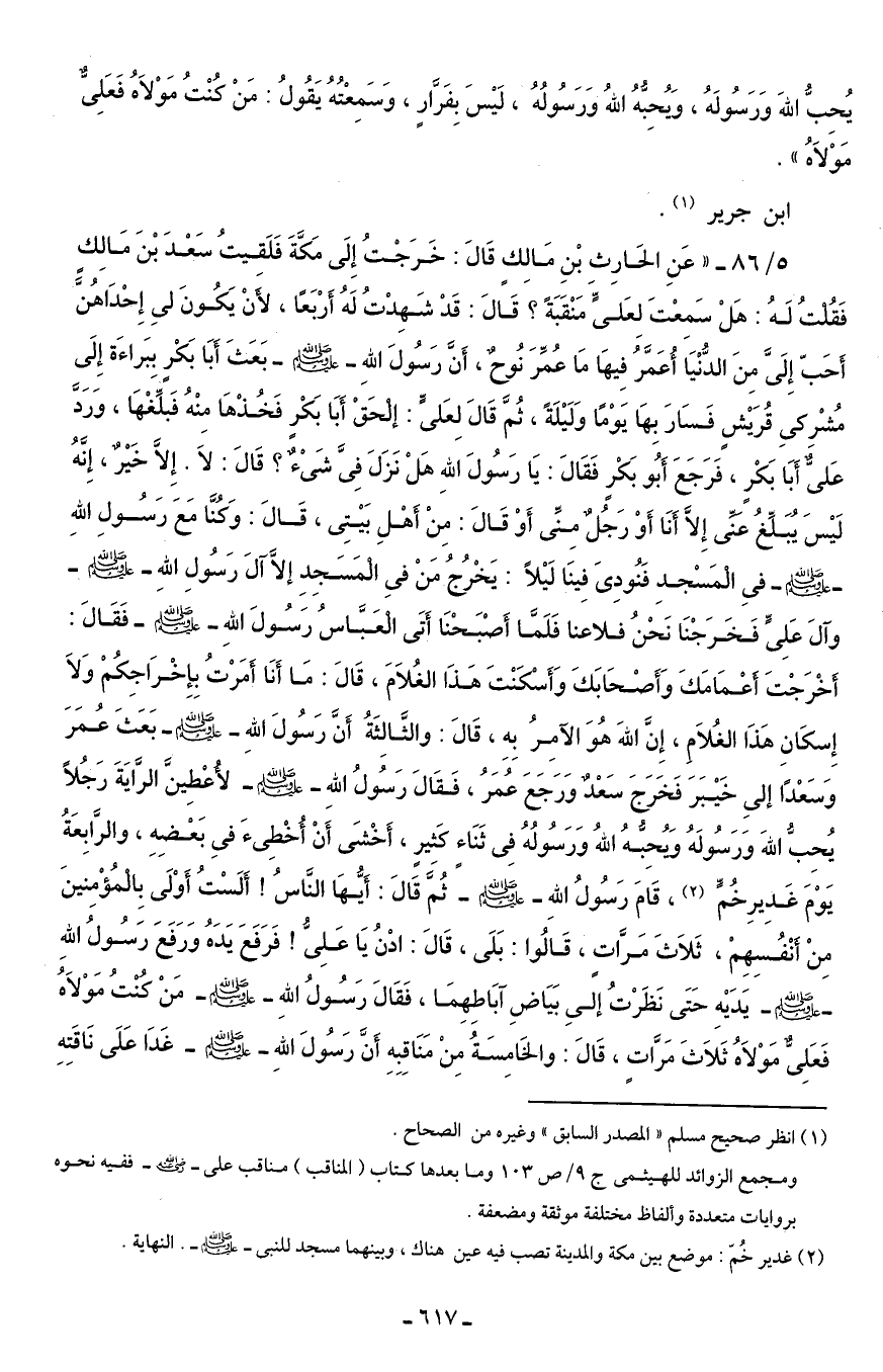 5/ 86 - "عَنِ الحَارِث بْنِ مَالِكٍ قَالَ: خَرَجْتُ إِلَى مَكَّةَ فَلَقِيتُ سَعْدَ بْنَ مَالِكٍ فَقُلْتُ لَهُ: هَلْ سَمِعْتَ لِعَلىٍّ مَنْقَبَةً؟ قَالَ: قَدْ شَهِدْتُ لَهُ أَرْبَعًا، لأَنْ يَكُونَ لِى إِحْدَاهُنَّ أَحَبّ إِلَىَّ مِنَ الدُّنْيَا أُعَمَّرُ فِيهَا مَا عُمِّرَ نُوحٌ، أَنَّ رَسُولَ اللهِ - صلى الله عليه وسلم - بَعَثَ أَبَا بَكْرٍ ببَراءَة إِلَى مُشْرِكِى قُرَيْشٍ فَسَارَ بِهَا يَوْمًا وَلَيْلَةً، ثُمَّ قَالَ لِعَلىٍّ: إلْحَقْ أَبَا بَكْرٍ فَخُذْهَا مِنْهُ فَبلِّغْهَا، وَرَدَّ عَلىٌّ أَبَا بَكْرٍ، فَرَجَعَ أَبُو بَكْرٍ فَقَالَ: يَا رَسُولَ اللهِ هَلْ نَزَلَ فِىَّ شَىْءٌ؟ قَالَ: لَا. إِلَّا خَيْرٌ، إِنَّهُ لَيْسَ يُبَلِّغُ عنِّى إِلَّا أَنَا أَوْ رَجُلٌ مِنِّى أَوْ قَالَ: مِنْ أَهْلِ بَيْتِى، قَالَ: وَكُنَّا مَع رَسُولِ اللهِ - صلى الله عليه وسلم - فِى الْمَسْجدِ فَنُودِىَ فِينَا لَيْلًا: يَخْرُجُ مَنْ فِى الْمَسَجِدِ إلَّا آلَ رَسُولِ اللهِ - صلى الله عليه وسلم - وآلَ عَلِىٍّ فَخَرَجْنَا نَحْنُ فلاعنا فَلَمَّا أَصْبَحْنَا أَتَى العَبَّاسُ رَسُولَ اللهِ - صلى الله عليه وسلم - فَقَالَ: أَخْرَجْتَ أعْمَامَكَ وَأَصْحَابَكَ وَأَسْكَنْتَ هَذَا الغُلَامَ، قَالَ: مَا أَنَا أَمَرْتُ بِإِخْرَاجِكُمْ وَلَا إِسكَانِ هَذَا الغُلَامِ، إِنَّ اللهَ هُوَ الآمِرُ بِهِ، قَالَ: والثَّالِثَةُ أَنَّ رَسُولَ اللهِ - صلى الله عليه وسلم - بَعَثَ عُمَرَ وَسَعْدًا إلى خَيْبَرَ فَخَرَجَ سَعْدٌ وَرَجَعَ عُمَرُ، فَقَالَ رَسُولُ اللهِ - صلى الله عليه وسلم - لأُعْطِينَّ الرَّايَةَ رَجُلًا يُحِبُّ اللهَ وَرَسُولَهُ ويُحِبُّهُ اللهُ وَرَسُولُهُ فِى ثَنَاءٍ كثِيرٍ، أَخْشَى أَنْ أُخْطِئَ فىِ بَعْضِهِ، والرَّابِعَةُ يَوْمَ غَدِيرِ خُمًّ (¬2)، قَامَ رَسُولُ اللهِ - صلى الله عليه وسلم - ثُمَّ قَالَ: أَيُّهَا النَّاسُ! أَلَسْتُ أَوْلَى بِالمُؤْمِنينَ مِنْ أنْفُسِهِمْ، ثَلَاثَ مَرَّاتٍ، قَالُوا: بَلَى، قَالَ: ادْنُ يَا عَلِىُّ! فَرَفَعَ يَدَهُ وَرَفَعَ رَسُولُ اللهِ - صلى الله عليه وسلم - يَدَيْهِ حَتَى نَظَرْتُ إِلَى بَيَاضِ آبَاطِهِمَا، فَقَالَ رَسُولُ اللهِ - صلى الله عليه وسلم - مَنْ كُنْتُ مَوْلَاهُ فَعَلِىٌّ مَوْلَاهُ ثَلَاثَ مَرَّاتٍ، قَالَ: والخَامِسَةُ مِنْ مَنَاقِبِهِ أَنَ رَسُولَ اللهِ - صلى الله عليه وسلم - غَدَا عَلَى نَاقَتِهِ