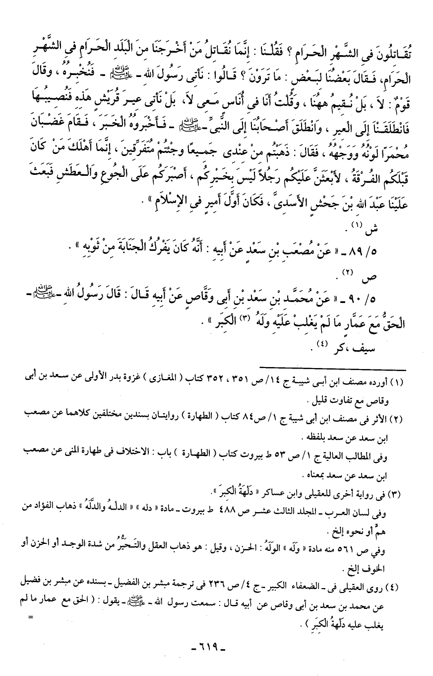 5/ 90 - "عَنْ مُحَمَّدِ بْنِ سَعْدِ بْنِ أَبِى وَقَّاصٍ عَنْ أَبِيهِ قَالَ: قَالَ رَسُولُ اللهِ - صلى الله عليه وسلم - الْحَقُّ مَعَ عَمَّارٍ مَا لَمْ يَغْلِبْ عَلَيْهِ وَلَهُ (¬3) الْكِبَر".