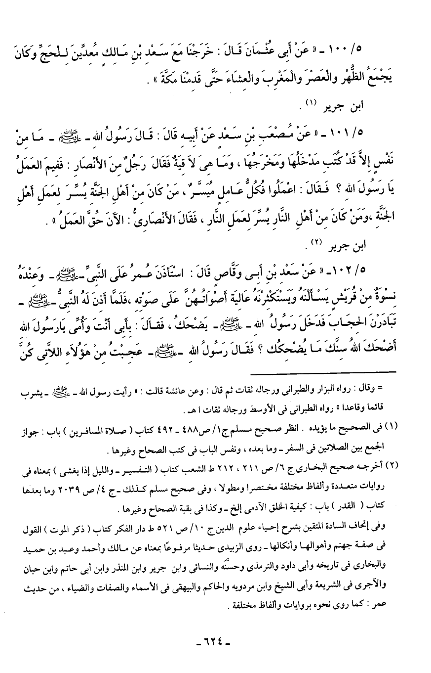 5/ 100 - "عَنْ أَبِى عُثْمَانَ قَالَ: خَرَجْنَا مَعَ سَعْدِ بْنِ مَالِك مُعِدَّينَ لِلحَجِّ وَكانَ يَجْمَعُ الظُّهْر والْعَصْرَ والْمَغْرِبَ والْعِشَاءَ حَتَّى قَدِمْنَا مَكَّةَ".