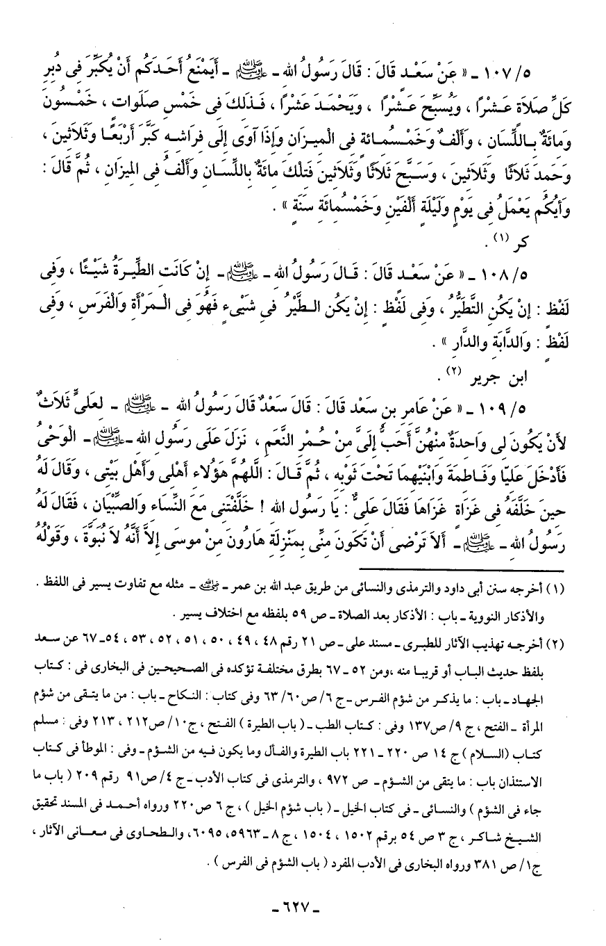 5/ 107 - "عَنْ سَعْدٍ قَالَ: قَالَ رَسُولُ اللهِ - صلى الله عليه وسلم - أَيَمْنَعُ أَحَدَكُم أَنْ يُكبِّرَ فِى دُبِرِ كَلِّ صَلَاةٍ عَشْرًا، وَيُسبِّحَ عَشْرًا، وَيَحْمَدَ عَشْرًا، فَذَلكَ فِى خمْسِ صَلَواتٍ، خَمْسُونَ وَمِائَةٌ بِاللِّسَانِ، وَأَلْفٌ وَخَمْسُمِائةٍ فِى الْمِيزَانِ وَإِذَا آوَىَ إِلَى فِرَاشه كَبَّرَ أَرْبَعًا وَثَلَاثِينَ، وَحَمِدَ ثَلَاثًا وَثَلَاثِينَ، وَسَبَّحَ ثَلَاثًا وَثَلَاثِينَ فَتِلْك مِائَةٌ بِاللِّسَانِ وَأَلفٌ فِى المِيزَانِ، ثُمَّ قَالَ: وَأيُكُم يَعْمَلُ فِى يَوْمٍ وَلَيْلَةٍ أَلْفَيْنِ وَخَمْسُمِائَةِ سَنَةٍ".