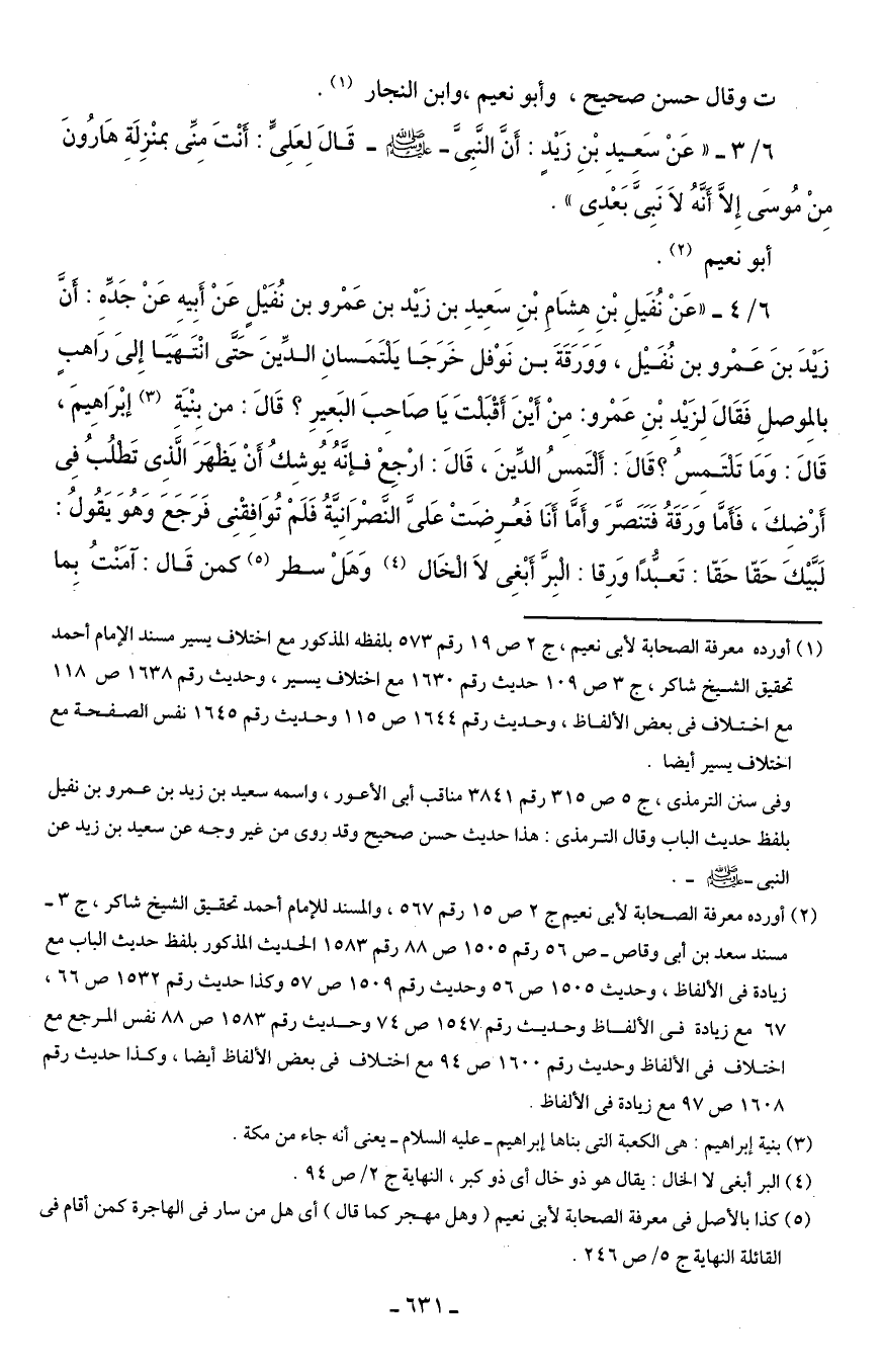 6/ 3 - "عَنْ سَعيدِ بْنِ زَيْدٍ: أَنَّ النَّبِىَّ - صلى الله عليه وسلم - قَالَ لِعَلِىٍّ: أنْتَ مِنِّى بمنْزِلَةِ هَارُونَ مِنْ مُوسَى إِلَّا أَنَّهُ لَا نَبِىَّ بَعْدِى".