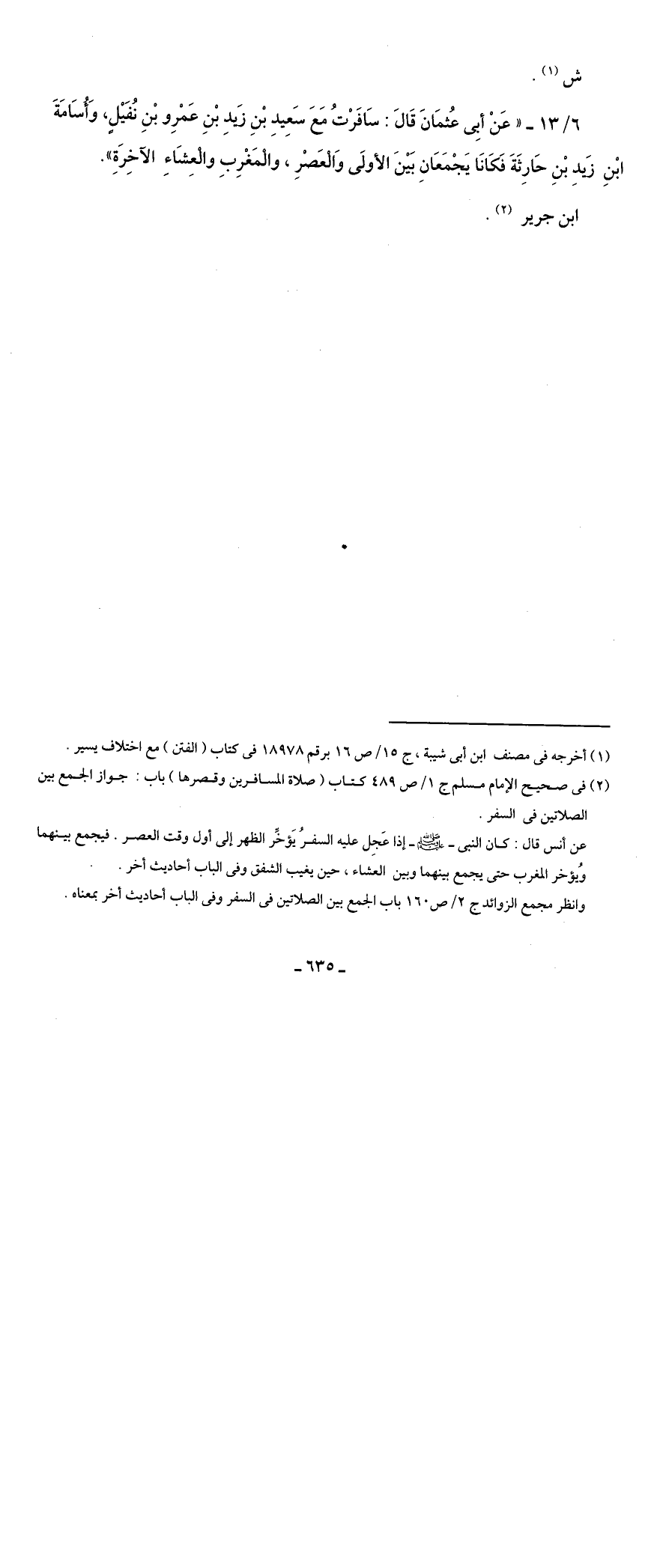 6/ 13 - "عَنْ أبِى عُثمَانَ قَالَ: سَافَرْتُ مَعَ سَعِيدِ بْنِ زَيدِ بْنِ عَمْرِو بْنِ نُفَيْلٍ، وَأُسَامَةَ بْنِ زَيدِ بْنِ حَارِثَةَ فَكَانَا يَجْمَعَانِ بَيْنَ الأولَى وَالْعَصْرِ، والْمَغْرِبِ والْعِشَاءِ الآخِرَةِ".