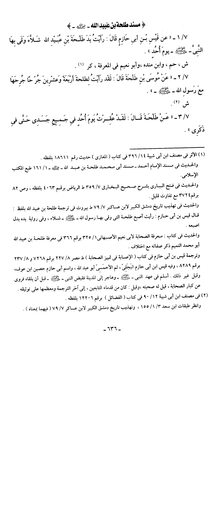 7/ 2 - "عَنْ مُوسَى بْنِ طَلْحَةَ قَالَ: لَقْد رَأَيْتُ لِطلحةَ أَرْبَعَةً وَعشْرِينَ جُرْحًا جُرِحَهَا معَ رَسولِ الله - صلى الله عليه وسلم -".