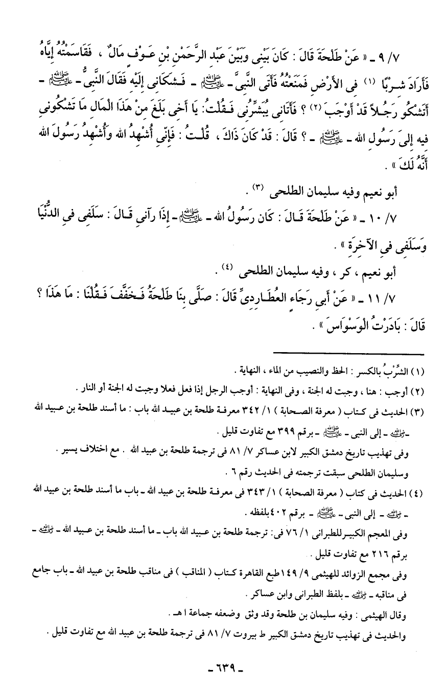 7/ 10 - "عَنْ طَلْحَةَ قَالَ: كَان رَسُولُ الله - صلى الله عليه وسلم - إِذَا رآنِى قَالَ: سَلَفِى فِى الدُّنْيَا وَسَلَفِى فِى الآخِرَةِ".