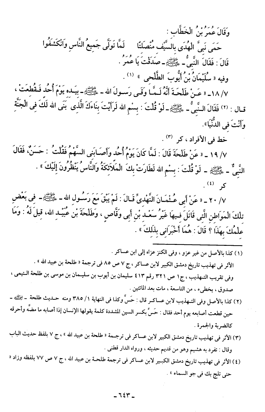 (¬4) الأثر في تهذيب تاريخ دمشق الكبير لابن عساكر في ترجمة طلحة بن عبيد الله، ج 7 ص 77 بلفظه وزاد "حتى تلج بك في جو السماء".
