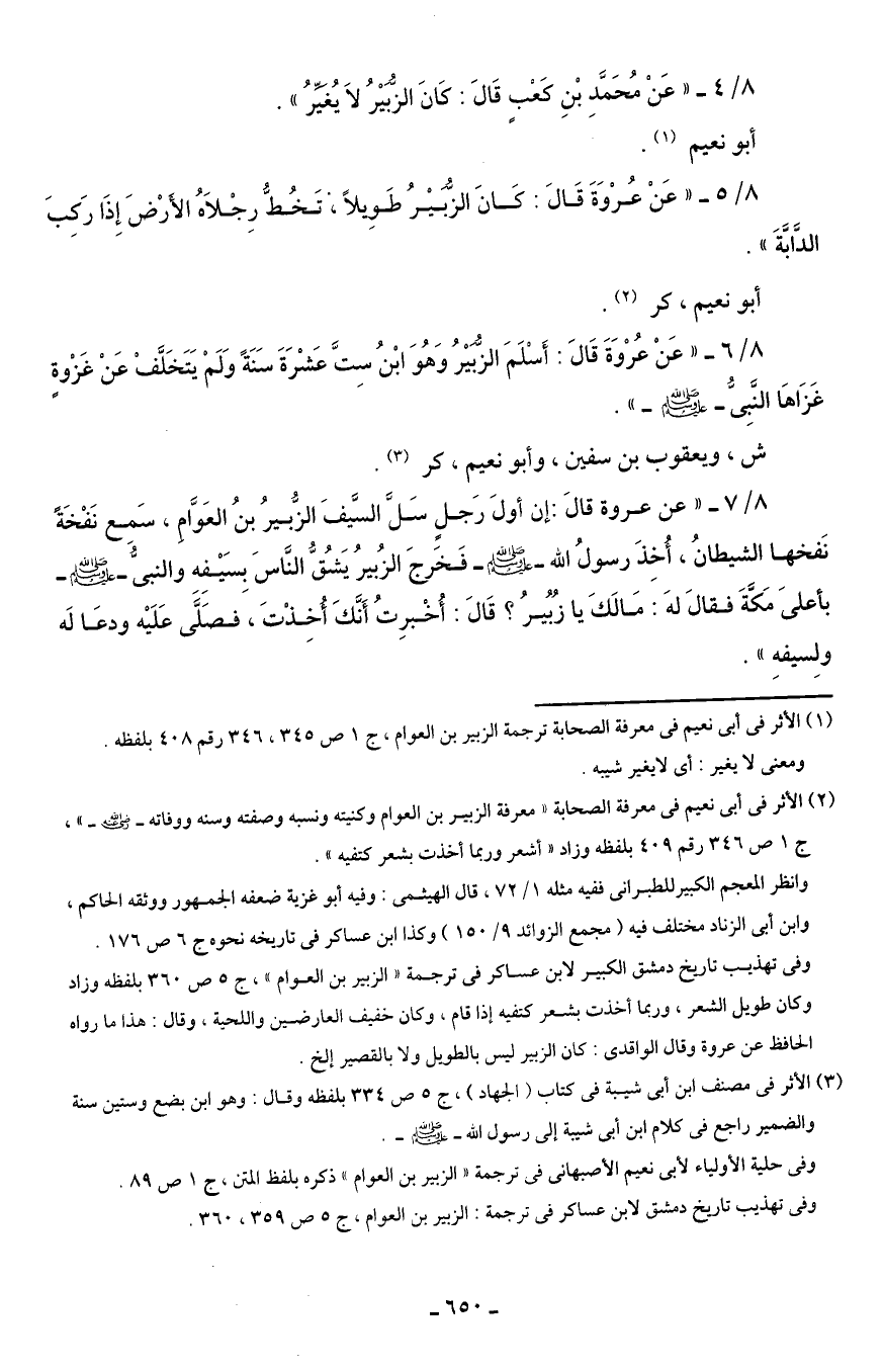 (¬2) الأثر في أبى نعيم في معرفة الصحابة "معرفة الزبير بن العوام وكنيته ونسبه وصفته وسنه ووفاته - رضي الله عنه -"، ج 1 ص 346 رقم 409 بلفظه وزاد "أشعر وربما أخذت بشعر كتفيه".