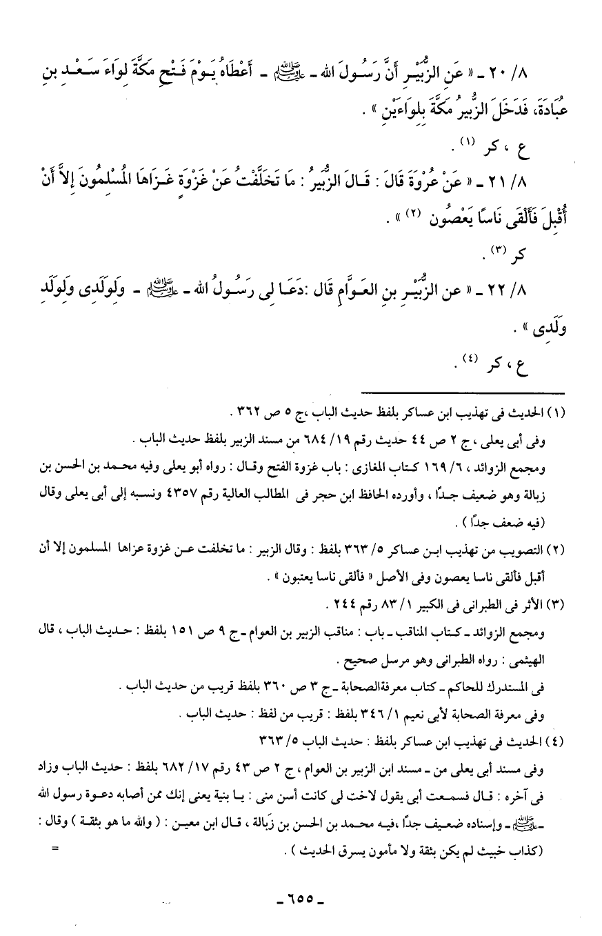 8/ 20 - "عَنِ الزُّبَيْرِ أَنَّ رَسُولَ الله - صلى الله عليه وسلم - أَعْطَاهُ يَوْمَ فَتْحِ مَكَّةَ لِوَاءَ سَعْدِ بنِ عُبَادَةَ، فَدَخَلَ الزُّبيرُ مَكَّةَ بِلِوَاءَيْنِ".
