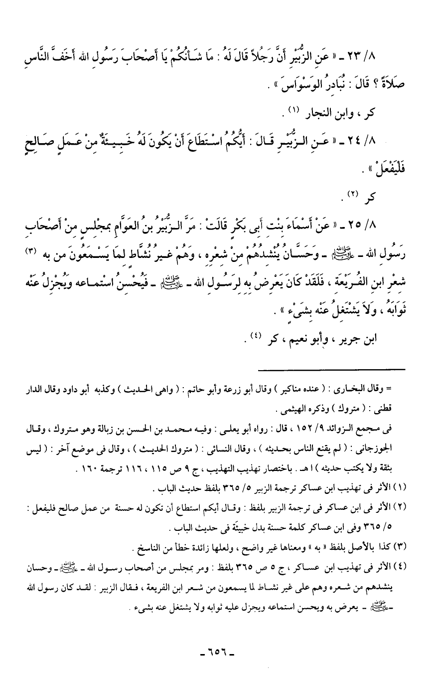 (¬4) الأثر في تهذيب ابن عساكر، ج 5 ص 365 بلفظ: ومر بمجلس من أصحاب رسول الله - صلى الله عليه وسلم - وحسان ينشدهم من شعره وهم على غير نشاط لما يسمعون من شعر ابن الفريعة، فقال الزبير. لقد كان رسول الله - صلى الله عليه وسلم - يعرض به ويحسن استماعه ويجزل عليه ثوابه ولا يشتغل عنه بشئ