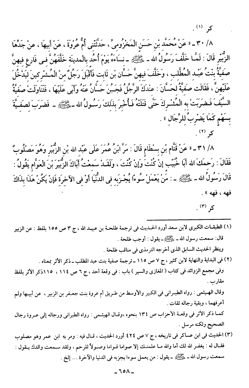 8/ 30 - "عَنْ مُحَمَّدِ بْنِ حَسَنٍ الْمَخْزُومِيِّ، حَدثَّتْنِى أُمُّ عُرْوَةَ، عَنْ أَبيهَا، عنْ جَدِّهَا الزُّبَيْرِ قَالَ: لَمَّا خَلَّفَ رَسُولُ الله - صلى الله عليه وسلم - نسَاءَهُ يَوْمَ أُحُد بِالْمدينَةِ خَلَفَهُنَّ في فَارعٍ فِيهِنَّ صَفِيَّةُ بنْتُ عَبْدِ الْمُطَّلِبِ، وَخَلَّفَ فِيِهِن حَسَّان بْن ثَابِتٍ فَأَقْبَلَ رَجُلٌ مِنْ الْمُشْرِكِينَ لِيَدْخُلَ عَلَيْهِنَّ، فَقَالَت صَفِيَّةُ لحَسَّانَ: عِنْدَكَ الرَّجُلُ فَجَبُنَ حَسَّانُ عَنْهُ وَأَبَى عَلَيْهَا، فَتَنَاوَلَتْ صَفِيَّةُ السَّيْفَ فَضَرَبَتْ بِهِ الْمُشْرِكَ حَتَّى قَتَلَتْهُ فَأُخبِرَ بِذَلِكَ رَسُولُ الله - صلى الله عليه وسلم - فَضَرَبَ لِصَفِيَّةَ بِسَهْمٍ كَمَا يَضْرِبُ لِلرِّجَالِ".