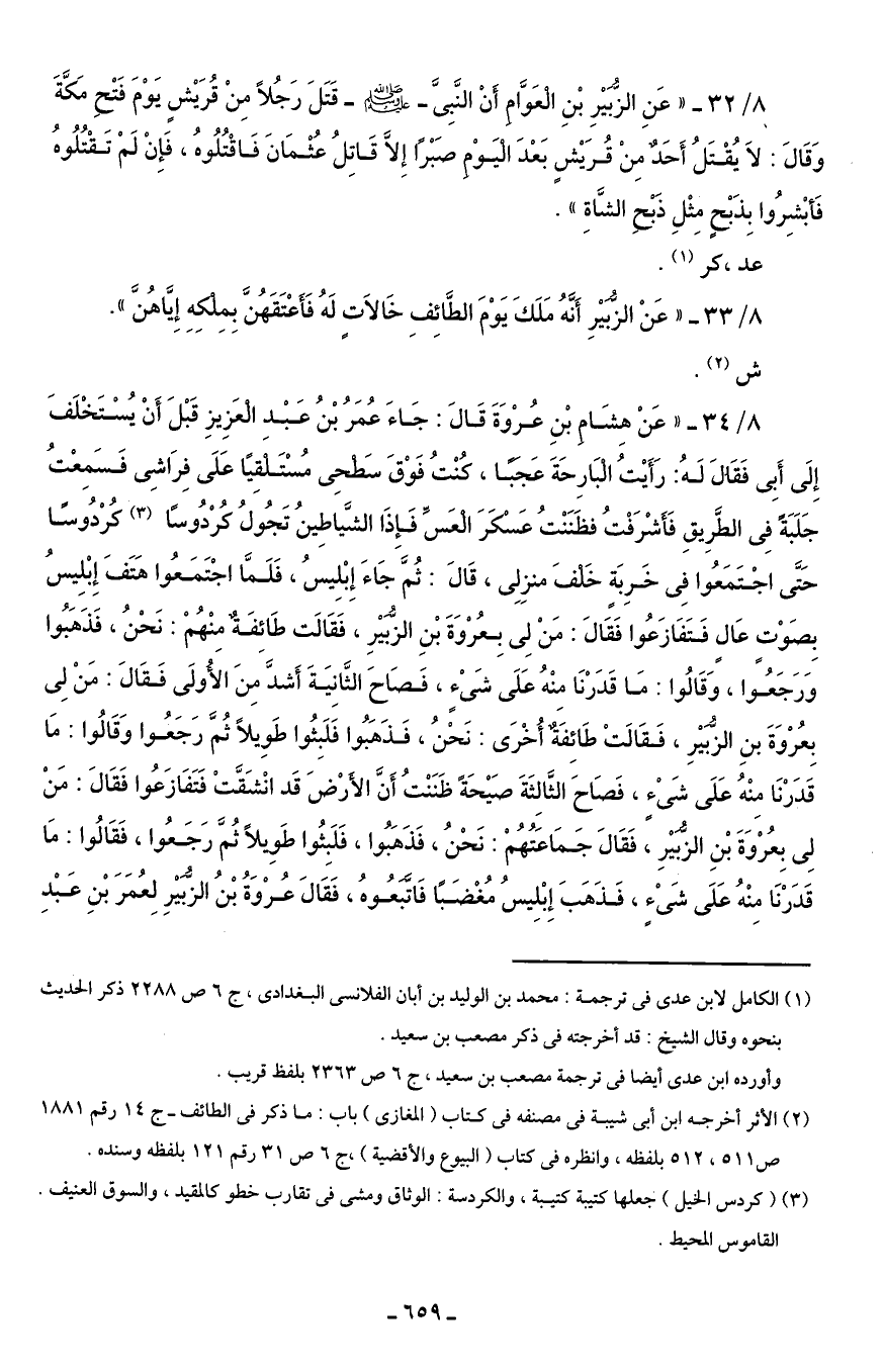 8/ 33 - "عَنْ الزُّبيْرِ أَنَّهُ مَلَكَ يَوْمَ الطَّائِفِ خَالاَتٍ لَهُ فَأَعْتَقَهُنَ بِمِلْكِهِ إِيَّاهُنَّ".