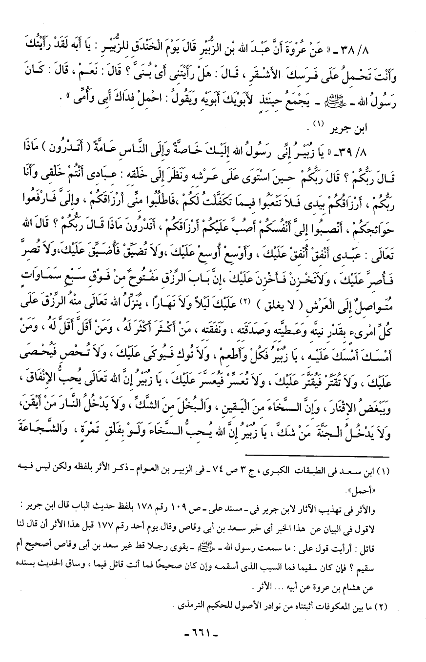 (¬1) ابن سعد في الطبقات الكبرى، ج 3 ص 74 - في الزبير بن العوام - ذكر الأثر بلفظه ولكن ليس فيه "أحمل".