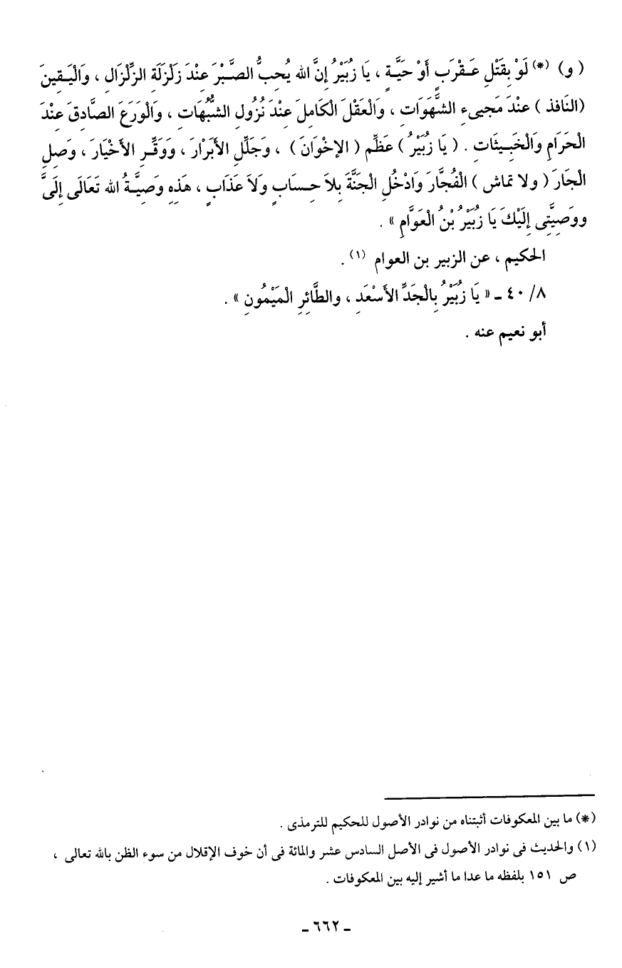 (و) (*) لَوْ بِقَتْلِ عَقْرَبٍ أوْ حَيَّةٍ، يَا زُبَيْرُ إِن الله يُحِبُ الصَّبْرَ عِنْدَ زَلْزَلَةِ الزِّلْزَالِ، وَالْيَقِينَ (النَافذ) عنْدَ مَجئِ الشَّهَوَاتِ، وَالْعَقْلَ الْكَامِلَ عِنْدَ نُزُولِ الشُّبُهَاتِ، وَالْوَرَعَ الصَّادِقَ عِنْدَ الْحَرَامِ وَالْخَبِيثَاتِ. (يَا زُبَيْرُ) عَظِّم (الإخْوَانَ)، وَجَلِّلِ الأبَرْارَ، وَوَقِّرِ الأَخْيَارَ، وَصِلِ الْجَارَ (ولا تماش) الْفُجَّارَ وَادْخُلِ الْجَنَّةَ بِلاَ حِسَابٍ وَلاَ عَذَابٍ، هَذِهِ وَصيَّةُ الله تَعَالَى إِلَىَّ ووَصِيَّتِى إِلَيْكَ يَا زبُيْرُ بْنُ الْعَوَّامِ".