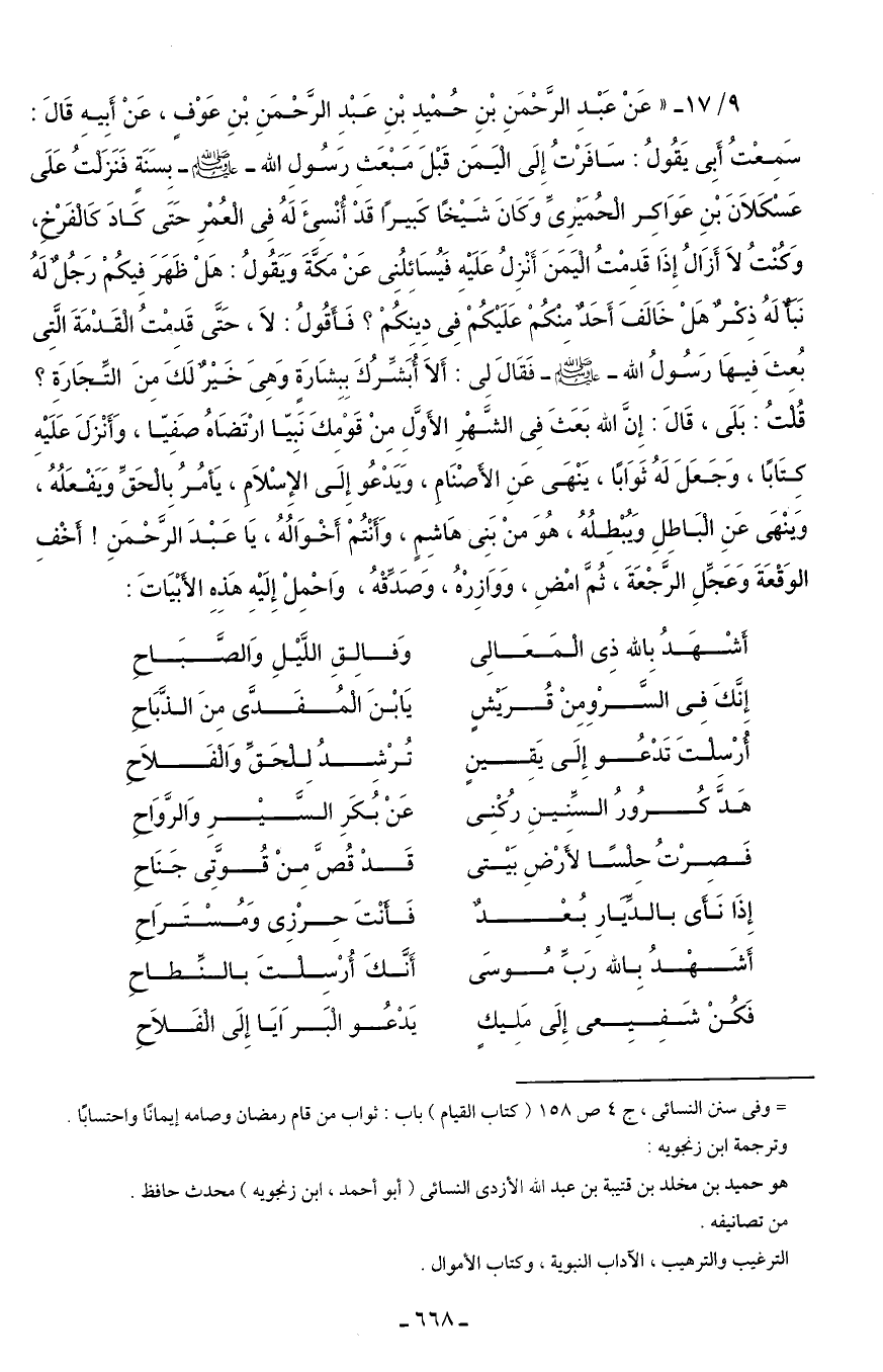 9/ 17 - "عَنْ عَبْدِ الرَّحْمَنِ بْنِ حُمْيدِ بْنِ عَبْدِ الرَّحْمَنِ بْنِ عَوْف، عَنْ أَبِيه قَالَ: سَمِعْتُ أَبِى يَقُولُ: سَافَرْتُ إِلَى الْيَمَن قَبْلَ مَبْعَثِ رَسُولِ الله - صلى الله عليه وسلم - بِسَنَةٍ فَنَزَلتُ عَلَى عَسْكَلاَنَ بْنِ عَوَاكِر الْحُمَيْرِيِّ وَكَانَ شَيْخًا كَبيرًا قَدْ أُنْسِئَ لَهُ في الْعُمْرِ حَتَّى كَادَ كَالْفَرخْ، وَكنْتُ لاَ أَزَالُ إِذَا قَدِمْتُ الْيَمَنَ أَنْزِلُ عَلَيْهِ فَيُسَائِلُنِى عَنْ مَكَّةَ وَيَقُولُ: هَلْ ظَهَرَ فِيكُمْ رَجُلٌ لَهُ نَبأٌ لَهُ ذِكْرٌ هَلْ خَالَفَ أَحَدٌ منْكُمْ عَلَيْكُمْ في دِينِكُمْ؟ فَأَقُولُ: لاَ، حَتَّى قَدِمْتُ الْقَدْمَةَ الَّتِى بُعِثَ فيهَا رَسُولُ الله - صلى الله عليه وسلم - فَقَالَ لِى: أَلاَ أُبَشِّرُكَ بِبِشَارَةٍ وَهِىَ خَيْر لَكَ مِنَ التِّجَارَةِ؟ قُلْتُ. بَلَى، قَالَ: إِنَّ الله بَعَثَ في الشَّهْرِ الأَوَّلِ مِنْ قَوْمِكَ نَبِيّا ارْتَضَاهُ صَفِيّا، وَأَنْزَلَ عَلَيْهِ كتَابًا، وَجَعَلَ لَهُ ثَوَابًا، يَنْهَى عَنِ الأَصْنَامِ، وَيَدْعُو إِلَى الإِسْلاَمِ، يَأمُرُ بِالْحَقِّ وَيَفْعَلُهُ، وَينْهَى عَنِ الْبَاطِلِ وَيُبْطِلُهُ، هُوَ منْ بَنِى هَاشِمٍ، وَأَنْتُمْ أَخْوَالُهُ، يَا عَبْدَ الرَّحْمَنِ! أَخْفِ الوَقْعَةَ وَعَجِّلِ الرَّجْعَةَ، ثُمَّ امْضِ، وَوَازِرْهُ، وَصَدِّقْهُ، وَاحْمِلْ إِلَيْهِ هَذِهِ الأبْيَاتَ:
