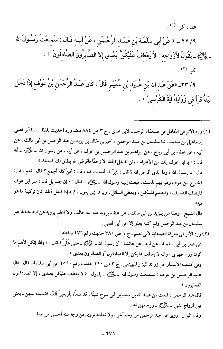 وفى كشف الأستار عن زوائد البزار للهيثمى، ج 3 ص 210 حديث رقم 2590 عن أبى سلمة، قال: قال عبد الرحمن بن عوف: سمعت رسول الله - صلى الله عليه وسلم - يقول: "لا يعطف عليكن بعدى، إلا الصادقون الصابرون".