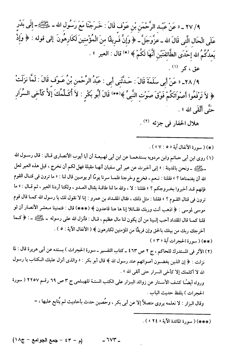 9/ 27 - "عَنْ عَبْدِ الرَّحْمَنِ بْنِ عَوْفٍ قَالَ: خَرَجْنَا مَعَ رَسُولِ الله - صلى الله عليه وسلم - إِلَى بَدْرٍ عَلَى الْحَالِ الَّتِى قَالَ الله - عزَّ وَجَلَّ - {وَإِنَّ فَرِيقًا مِنَ الْمُؤْمِنِينَ لَكَارِهُونَ} إلى قوله: {وَإِذْ يَعِدُكُمُ اللَّهُ إِحْدَى الطَّائِفَتَيْنِ أَنَّهَا لَكُمْ} (*) قال: العير".