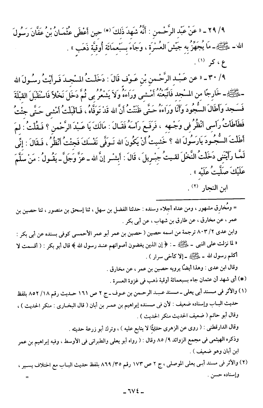 9/ 29 - "عَنْ عَبْدِ الرَّحْمنِ: أَنَّهُ شَهِدَ ذَلِكَ (*) حِين أَعْطَى عُثْمَانُ بْنُ عَفَّانَ رَسُولَ الله - صلى الله عليه وسلم - مَا يُجَهَزُ بِهِ جَيْشَ العُسْرَة، وَجَاءَ بسَبْعمَائَة أُوقيَّة ذَهَبٍ".