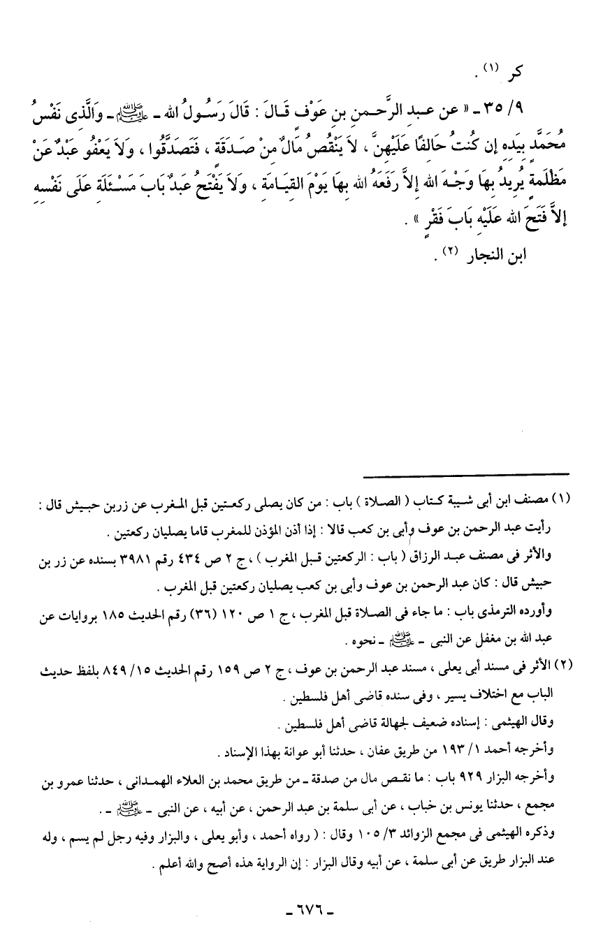 9/ 35 - "عن عبدِ الرَّحمنِ بنِ عَوْفٍ قَالَ: قَالَ رَسُولُ الله - صلى الله عليه وسلم - وَالَّذِى نَفْسُ مُحَمَّد بِيَدِهِ إن كنُتُ حَالِفًا عَلَيْهِنَّ، لاَ يَنْقُصُ مَالٌ مِنْ صَدَقَةٍ، فَتَصَدَّقُوا، وَلاَ يَعْفُو عَبْدٌ عَنْ مَظلَمةً يُرِيدُ بِهَا وَجْهَ الله إلَّا رَفَعَهُ الله بِهَا يَوْمَ القِيَامَةِ، وَلاَ يَفْتَحُ عَبدٌ بَابَ مَسْئَلَةِ عَلَى نَفْسِهِ إلَّا فَتَحَ الله عَلَيْهِ بَابَ فَقْرٍ".