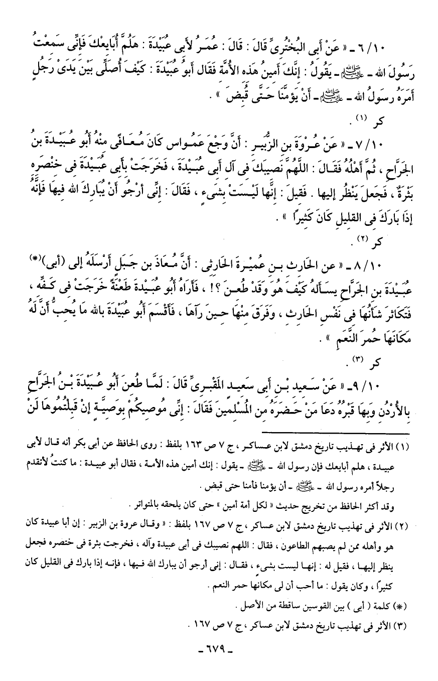 10/ 8 - "عن الحَارِثِ بنِ عُميْرةَ الحَارِثِى: أَنَّ مُعَاذَ بن جَبَلٍ أَرْسَلَهُ إلى (أبى) (*) عُبَيْدَةَ بنِ الجَرَّاحِ يسَأَلهُ كَيْفَ هُوَ وَقَدْ طُعنَ؟ ! ، فَأَرَاهُ أبُو عُبَيْدةَ طَعْنَةً خَرَجَتْ في كفِّه، فَتَكَاثرَ شَأنُهَا في نَفْسِ الحَارِثِ، وَفَرَقَ مِنْهًا حِينَ رآهَا، فَأَقْسَمَ أَبُو عُبَيْدَةَ بالله مَا يُحِبُّ أنَّ لَهُ مَكَانَهَا حُمرَ النَّعَم".