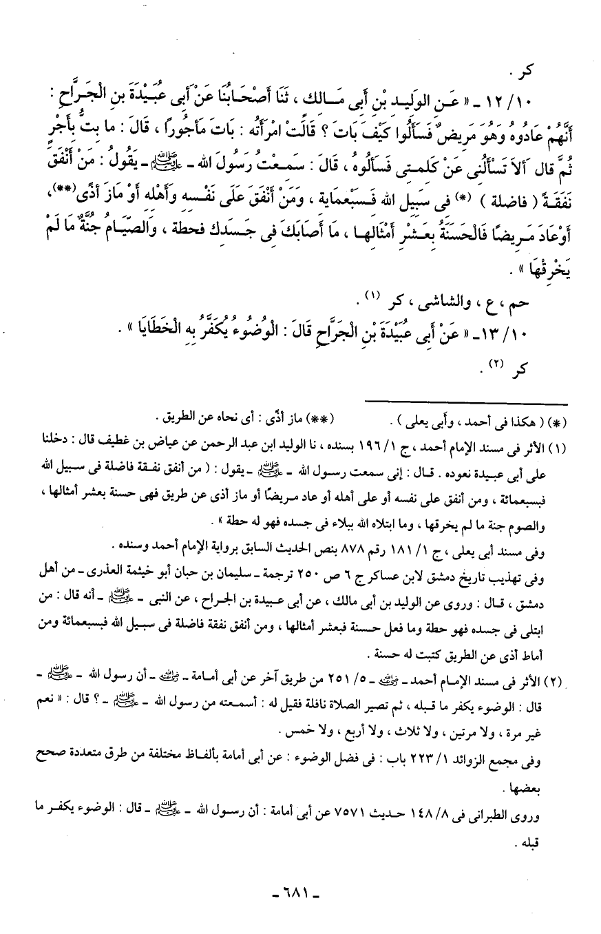 10/ 12 - "عَنِ الوَليدِ بْنِ أَبِى مَالك، ثَنَا أَصْحَابُنَا عَنْ أبِى عُبَيْدَةَ بنِ الْجَرَّاح: أنَّهُمْ عَادُوهُ وَهُوَ مَرِيضٌ فَسَأَلُوا كيْفَ بَاتَ؟ قَالَتْ امْرَأَتُه: بَاتَ مَأجُورًا، قَالَ: ما بِتُّ بأَجْرٍ ثُمَّ قالَ ألاَ تَسْأَلُنِى عَنْ كَلمتِى فَسَألُوهُ، قَالَ: سَمِعْتُ رَسُولَ الله - صلى الله عليه وسلم - يَقُولُ: مَنْ أَنْفَقَ نَفَقَةً (فاضلة) (*) في سَبِيِل الله فَسَبْعمَاية، وَمَنْ أَنْفَقَ عَلَى نَفْسِه وَأهْلِه أوْ مَازَ أذًى (* *)، أَوْ عَادَ مَرِيضًا فَالْحَسَنَةُ بِعَشْرِ أَمْثَالَها، مَا أَصَابَكَ في جَسَدِك فحطَة، وَالصّيَامُ جُنَّةٌ مَا لَمْ يَخْرِقْهَا".