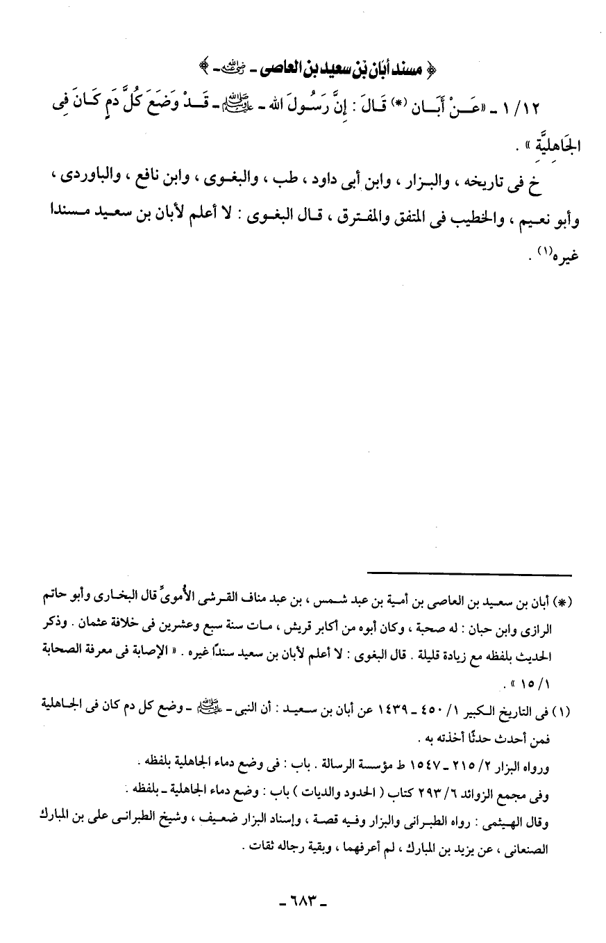 12/ 1 - " عَنْ أَبَان (*) قَالَ: إِنَّ رَسُولَ الله - صلى الله عليه وسلم - قَدْ وَضَعَ كُلَّ دَمٍ كَانَ في الجَاهِليَّةِ".