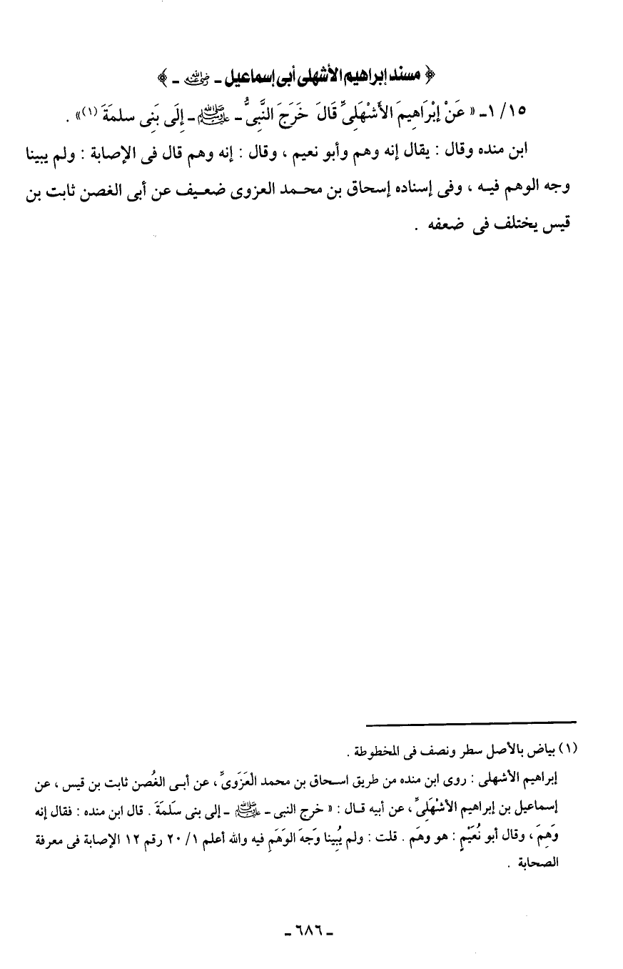 إبراهيم الأشهلى: روى ابن منده من طريق إسحاق بن محمد الْعَزَوىِّ، عن أبى الغُصن ثابت بن قيس، عن إسماعيل بن إبراهيم الأَشْهَلِىِّ، عن أبيه قال: "خرج النبي - صلى الله عليه وسلم - إلى بنى سَلمَةَ. قال ابن منده: فقال إنه وَهِمَ، وقال أبو نُعَيْمٍ: هو وهَم. قلت: ولم يُبيِنا وَجة الوَهَمِ فيه والله أعلم 1/ 20 رقم 12 الإصابة في معرفة الصحابة.