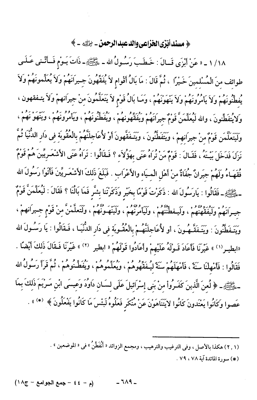 18/ 1 - " عَنْ أَبْزَى قَالَ: خَطَبَ رَسُولُ الله - صلى الله عليه وسلم - ذَاتَ يَوْمٍ فَأَثْنى عَلَى طوائِف مِنَ الْمُسْلِمِينَ خَيْرًا، ثُمَّ قَالَ: مَا بَالُ أَقْوامٍ لاَ يُفَقِّهُونَ جِيرَانَهُمْ وَلاَ يُعَلِّمونَهُمْ وَلاَ يُفِطِّنُونَهُمْ وَلاَ يَأمُرُونَهُمْ وَلاَ يَنْهَوْنَهُمْ، وَمَا بَالُ قَوْمٍ لاَ يَتَعَلَّمُونَ مِنْ جِيرَانهمْ وَلاَ يتفقهون، وَلا يُتفَطِّنونَ، والله لَيُعَلِّمَنَّ قَوْمٌ جِيرَانَهُمْ وَيُفَقِّهُونهُمْ، وَيُفَطِّنُونَهُمْ، وَيَأمُرُونَهُمْ، وَيَنْهَوْنَهُمْ، وَلَيَتَعَلَّمَن قَوْمٌ مِنْ جِيرَانِهِم، وَيَتَفَطَّنُونَ، وَيَتَفَقَّهونَ أَوْ لأُعَاجِلَنَّهُمْ بِالْعُقُوبَةِ فِى دَارِ الدُّنْيَا ثُمَّ نَزَلَ فَدَخَلَ بَيْتَهُ، فَقَالَ: قَوْمٌ مَنْ تُرَاهُ عَنَى بِهَؤُلاَءِ؟ فَقَالُوا: تَرَاهُ عَنَى الأَشْعَرِيَينَ هُمْ قَوْمٌ فُقَهَاءُ وَلَهُمْ جِيَرانٌ جُفَاةٌ مِنْ أَهْلِ الْمِيَاهِ والأَعْرَابِ. فَبَلَغَ ذَلِكَ الأَشْعَريَينَ فَأَتَوْا رَسُولَ الله - صلى الله عليه وسلم - فَقَالُوا: يَا رَسُولَ الله: ذَكَرْتَ قَوْمًا بِخَيْر وَذَكَرْتَنا بِشَّر فَمَا بَالُنَا؟ فَقَالَ: لَيُعَلِّمَنَّ قَوْمٌ جِيرَانَهُمْ وَلَيُفَقِّهُنَّهُمْ، وَلَيفطِّنُنَّهُمْ، وَلَيَأمُرُنَّهُمْ، وَلَيَنْهوُنَّهُمْ، وَلَتَعلَّمْنَّ مِنْ قَوْمٍ جِيرَانهمْ، وَيَتَفَطَّنُونَ: وَيَتَفَقَّهُونَ، أو لأُعَاجِلَنَّهُمْ بِالْعُقُوبَةِ فِى دَارِ الدُّنْيَا، فَقَالُوا: يَا رَسُولَ الله "ابطير (¬1) " غَيْرَنَا فأَعَادَ قَوْلَهُ عَلَيْهِمْ وأعَادُوا قَوْلَهُمْ "ابطير (¬2) " غَيْرَنَا فَقَالَ ذَلِكَ أَيْضًا. فَقَالُوا: فَأَمْهِلْنَا سَنَةً، فَأهْهَلَهُمْ سَنَةً لِيُفَقِّهُوهُمْ، ويُعَلِّمُوهُمْ، وَيُفَطِّنُوهُمْ، ثُمَّ قَرَأَ رَسُولُ الله - صلى الله عليه وسلم - {لُعِنَ الَّذِينَ كَفَرُوا مِنْ بَنِي إِسْرَائِيلَ عَلَى لِسَانِ دَاوُودَ وَعِيسَى ابْنِ مَرْيَمَ ذَلِكَ بِمَا عَصَوْا وَكَانُوا يَعْتَدُونَ (78) كَانُوا لَا يَتَنَاهَوْنَ عَنْ مُنْكَرٍ فَعَلُوهُ لَبِئْسَ مَا كَانُوا يَفْعَلُونَ} (*) ".