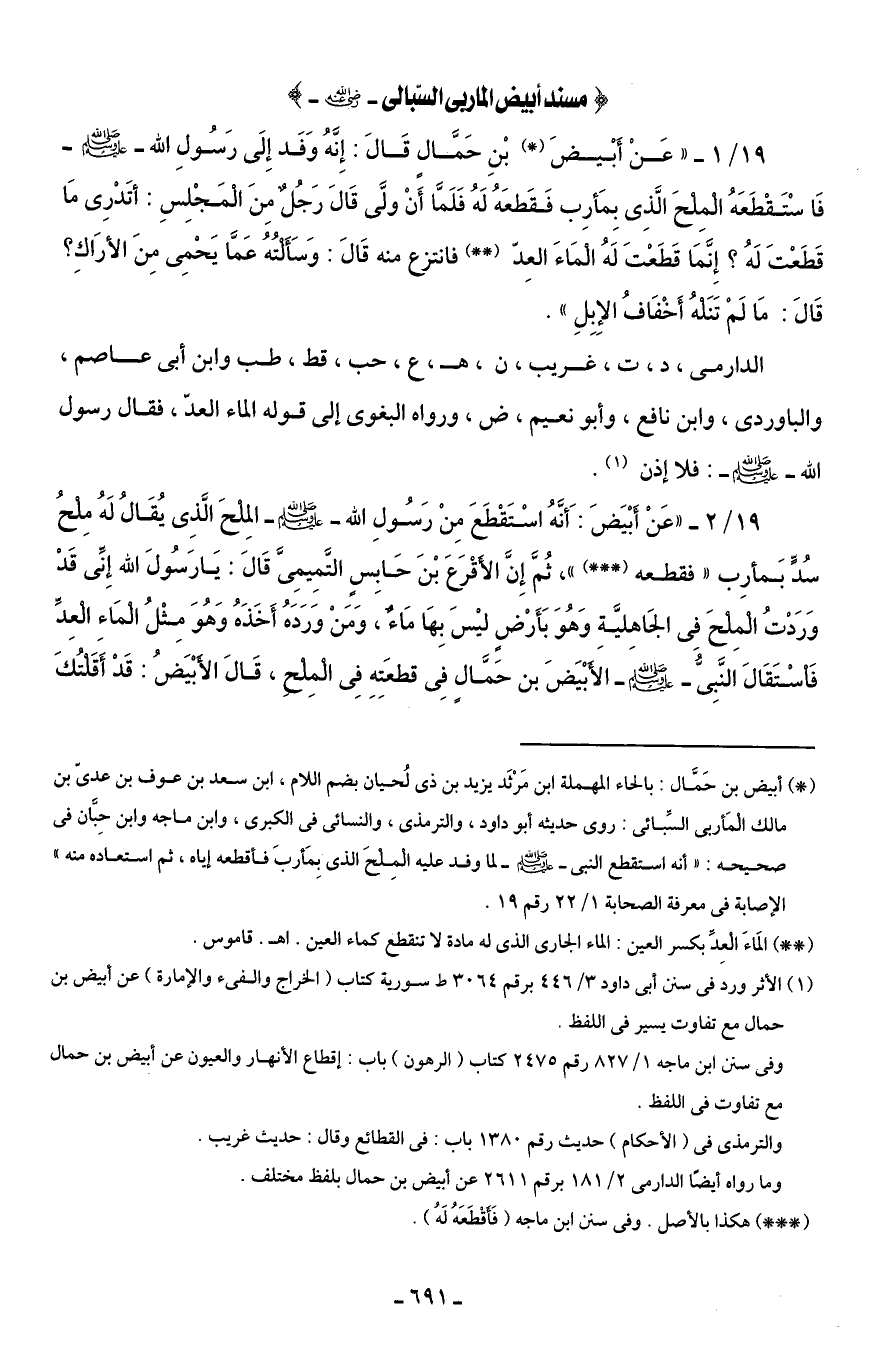 19/ 1 - " عَنْ أَبْيضَ (*) بْنِ حَمَّالٍ قَالَ: إِنَّهُ وَفَد إِلَى رَسُولِ الله - صلى الله عليه وسلم - فَاسْتَقْطَعَهُ الْمِلحَ الَّذِى بِمَأرِب فَقَطعَهُ لَهُ فَلَمَّا أَنْ ولَّى قَالَ رَجُلٌ مِنَ الْمَجْلِسِ: أتَدْرِى مَا قَطَعْتَ لَهُ؟ إِنَّمَا قَطَعْتَ لَهُ الْمَاءَ العِدّ (*) فانتزع منه قَالَ: وَسَأَلْتُهُ عَمَّا يَحْمِى مِنَ الأرَاكِ؟ قَالَ: مَا لَمْ تَنَلْهُ أَخْفَافُ الإِبِلِ".