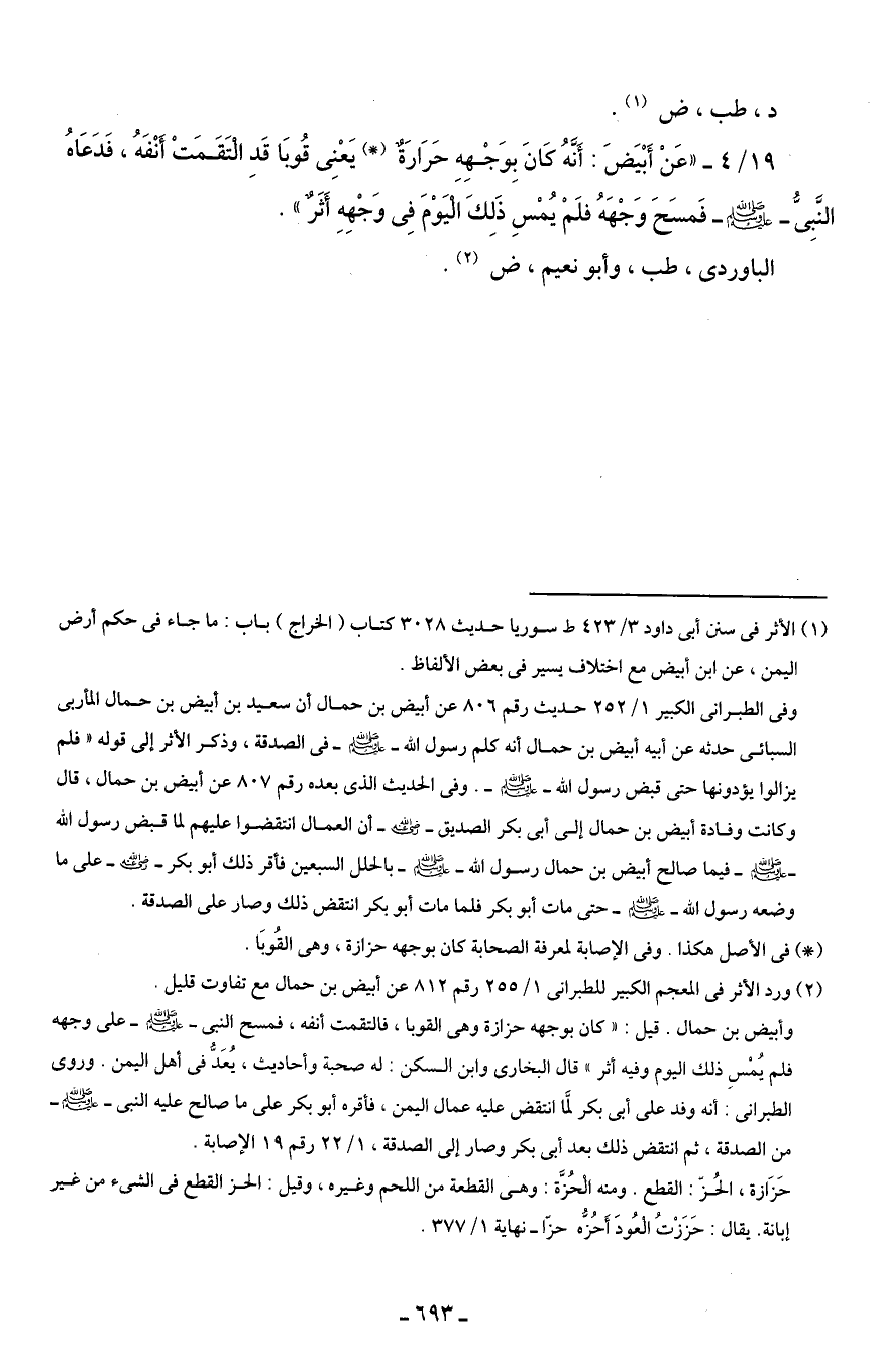 19/ 4 - "عَنْ أَبْيَضَ: أَنَّهُ كَانَ بِوَجْهِهِ حَرَارَةٌ (*) يَعْنِى قُوبَا قَدِ الْتَقَمَتْ أَنْفَهُ، فَدَعَاهُ النَّبِىُّ - صلى الله عليه وسلم - فَمسَحَ وَجْهَهُ فلَمْ يُمْسِ ذَلِكَ الْيَوْمَ فِى وَجْهِهِ أَثَرٌ".