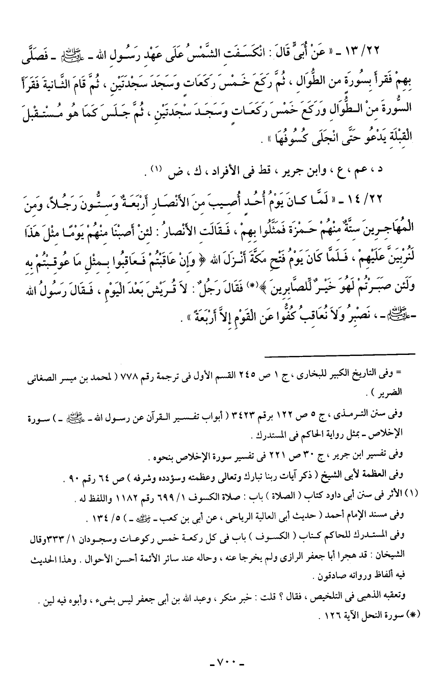 22/ 13 - "عَنْ أُبَىٍّ قَالَ: انْكَسَفَتِ الشَّمْسُ عَلَى عَهْدِ رَسُولِ الله - صلى الله عليه وسلم - فَصَلَّى بِهِمْ فَقرأَ بِسُورَة من الطُّوَالِ، ثُمَّ رَكَعَ خَمْسَ رَكَعَاتٍ وَسَجَدَ سَجْدَتَيْنِ، ثُمَّ قَامَ الثَّانيةَ فَقَرَأَ السُّورةَ مِنْ الطُّوَالِ وَرَكَعَ خَمْسَ رَكَعَات وَسَجَدَ سْجَدتَيْنِ، ثُمَّ جَلَسَ كَمَا هُو مُسْتقْبلَ الْقِبْلَةِ يَدْعُو حَتَّى انْجَلَى كُسُوفُهَا".