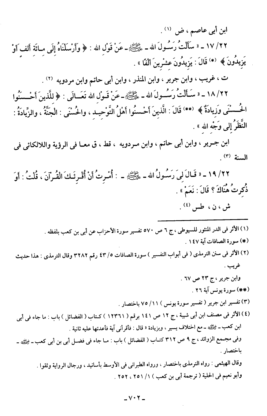 22/ 18 - "سَأَلْتُ رَسُولَ الله - صلى الله عليه وسلم - عَنْ قَوْلِ الله تَعَالَى: {لِلَّذِينَ أَحْسَنُوا الْحُسْنَى وَزِيَادَةٌ} (*) قَالَ: الَّذيِنَ أَحْسنُوا أَهْلُ التَّوْحِيدِ، والحُسْنَى: الْجَنَّةُ، والزِّيادَةُ: النَّظَرُ إِلى وَجْهِ اللهِ".