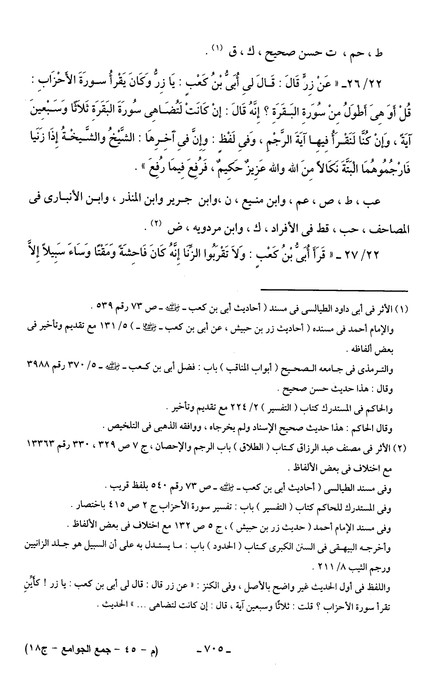 22/ 26 - "عَنْ زِرٍّ قَالَ: قَالَ لي أُبَىُّ بْنُ كَعْبٍ: يَا زِرُّ وَكَانَ يَقْرأُ سورَةَ الأَحْزَابِ: قُلْ أَوَ هِىَ أَطْوَلُ مِنْ سُوَرةِ البَقَرَةِ؟ إِنَّهُ قَالَ: إنْ كَانَتْ لَتُضَاهِى سُورَةَ البَقَرَةِ ثَلاَثًا وَسبْعِينَ آيَةً، وَإنْ كُنَّا لَنَقْرَأُ فِيهِا آيَةَ الرَّجْمِ، وَفي لَفْظٍ: وِإِنَّ في آخِرِهَا: الشَّيْخُ والشَّيخْةُ إِذَا زَنَيا فَارْجُمُوهُمَا الْبَتَّةَ نَكَالًا مِنَ الله والله عَزِيزٌ حَكِيمٌ، فَرُفِعَ فِيمَا رُفِعَ".