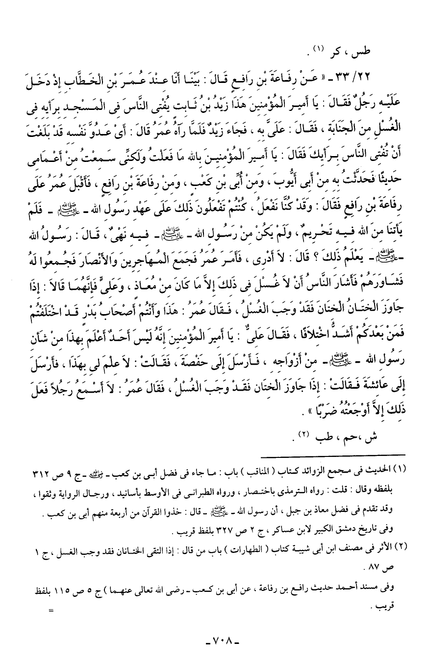 22/ 33 - "عَنْ رِفَاعَةَ بْنِ رَافِعٍ قَالَ: بَيْنَا أَنَا عِنْدَ عُمَرَ بْنِ الْخَطَّاب إِذْ دَخَلَ عَلَيْه رَجُلٌ فَقَالَ: يَا أَمِيرَ الْمُؤْمِنيِنَ هَذَا زَيْدُ بْنُ ثَابِت يُفْتِى النَّاسَ فِى الْمَسْجِدَ بِرَأيِهِ فِى الْغُسْلَ مِنَ الْجَنَابَةِ، فَقَالَ: عَلَىَّ بِهِ، فَجَاءَ زَيدٌ فَلَمَّا رَآهُ عُمَرُ قَالَ: أَىْ عَدُوَّ نَفْسِهِ قَدْ بَلَغْتَ أَنْ تُفْتِى النَّاسَ بِرَأيِكَ فَقَالَ: يَا أَمِيرَ الْمُؤْمِنيِنَ بِالله مَا فَعَلتُ وَلَكِنِّى سَمِعْتُ مِنْ أَعْمَامِى حَدِيثًا فَحَدَّثْتُ بِهِ مِنْ أَبِى أَيُّوبَ، وَمِنْ أُبيِّ بْنِ كَعْبٍ، وَمِنْ رِفَاعَةَ بْنِ رَافِعٍ، فَأَقْبَلَ عُمَرُ عَلَى رِفَاعَةَ بْنِ رَافِعٍ فَقَالَ: وَقَد كُنَّا نَفْعَلُ، كُنْتُمْ تَفْعَلُونَ ذَلِكَ عَلَى عَهْدِ رَسُولِ الله - صلى الله عليه وسلم - فَلَمْ يَأتنَا مِنَ الله فِيهِ تَحْرِيمٌ، وَلَم يَكُنْ مِنْ رَسُولِ الله - صلى الله عليه وسلم - فيهِ نَهْىٌ، قَالَ: رَسُولُ الله - صلى الله عليه وسلم - يَعْلَمُ ذَلِكَ؟ قَالَ: لاَ أَدْرِى، فَأَمَرَ عُمَرُ فَجَمَعَ الْمُهَاجِرِينَ وَالأَنْصَارَ فَجُمِعُوا لَهُ فَشَاوَرَهُمْ فَأَشَارَ النَّاسُ أَنْ لاَ غُسْلَ فِى ذَلِكَ إِلاَّ مَا كَانَ مِنْ مُعَاذٍ، وَعَلِىٍّ فَإِنَّهُمَا قَالَا: إِذَا جَاوَزَ الْخِتَانُ الْختَانَ فَقَد وَجَبَ الْغُسْلُ، فَقَالَ عُمَرُ: هَذَا وَأَنْتُمْ أَصْحَابُ بَدْرٍ قَدْ اخْتَلَفْتُمْ فَمَنْ بَعْدَكُمْ أَشَدُّ اخْتِلاَفًا، فَقَالَ عَلِى: يَا أَمِيرَ الْمُؤْمِنيِنَ إِنَّهُ لَيْسَ أَحَدٌ أَعْلَمَ بِهذَا مِنْ شَأنِ رَسُولِ الله - صلى الله عليه وسلم - مِنْ أَزْوَاجِهِ، فَأَرْسَلَ إِلَى حَفْصَةَ، فَقَالَتْ: لاَ عِلْمَ لي بِهَذَا، فأَرْسَلَ إِلَى عَائِشَةَ فَقَالَتْ: إِذَا جَاوَزَ الْخِتَان فَقَدْ وَجَبَ الْغُسْلُ، فَقَالَ عُمَرُ: لاَ أَسْمَعُ رَجُلًا فَعَلَ ذَلِكَ إِلاَّ أَوْجَعْتُهُ ضَرْبًا".