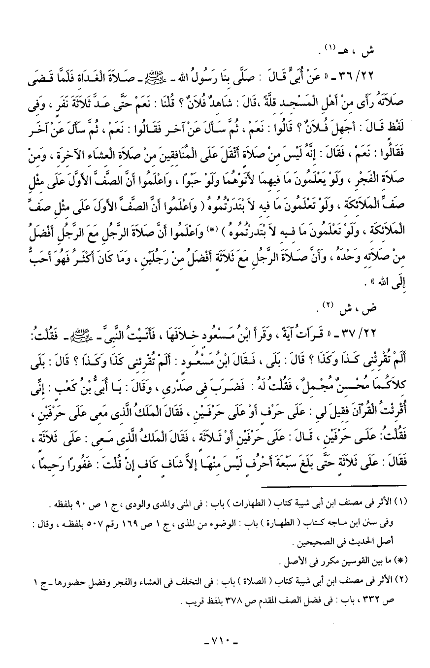 22/ 36 - "عَنْ أُبَىٍّ قَالَ: صَلَّى بِنَا رَسُولُ الله - صلى الله عليه وسلم - صَلاَةَ الْغَدَاةِ فَلَمَّا قَضَى صَلاَتَهُ رَأَى مِنْ أَهْلِ الْمَسْجِدِ قِلَّةً، قَالَ: شَاهِدٌ فُلاَنٌ؟ قُلنَا: نَعَمْ حَتَّى عَدَّ ثَلاَثَةَ نَفَرٍ، وَفِى لَفْظٍ قَالَ: أجَهِلَ فُلاَنٌ؟ قَالُوا: نَعَمْ، ثُمَّ سأَلَ عَنْ آخر فَقَالُوا: نَعَمْ، ثُمَّ سَأَلَ عَنْ آخَر فَقَالُوا: نَعَمْ، فَقَالَ: إِنَّهُ لَيْسَ مِنْ صَلاَةٍ أَثْقَلَ عَلَى الْمُنَافِقِينَ مِنْ صَلاَةِ الْعشَاءِ الآخِرَةِ، وَمِنْ صَلاَة الْفَجْرِ، وَلَوْ يَعْلَمُونَ مَا فِيهِمَا لأَتَوْهُمَا وَلَوْ حَبْوًا، وَاعْلَمُوا أَنَّ الصَّفَّ الأَوَّلَ عَلَى مِثْلِ صَفِّ الْمَلاَئِكَةِ، وَلَوْ تَعْلَمُونَ مَا فِيهِ لاَبْتَدَرْتُمُوهُ (وَاعْلَمُوا أَنَّ الصَّفَّ الأَوَلَ عَلَى مثْلِ صَفِّ الْمَلاَئِكَةِ، وَلَوْ تَعْلَمُونَ مَا فِيهِ لاَبْتَدرْتُمُوهُ) (*) وَاعْلَمُوا أَنَّ صَلاَةَ الرَّجُلِ مَعَ الرَّجُلِ أَفْضَلُ مِنْ صَلاَتِهِ وَحْدَهُ، وَأَنَّ صَلاَةَ الرَّجُلِ مَعَ ثَلاَثَةٍ أَفْضَلُ مِنْ رَجُلَيْنِ، وَمَا كَانَ أكثَرُ فَهُوَ أَحَبُّ إِلَى الله".