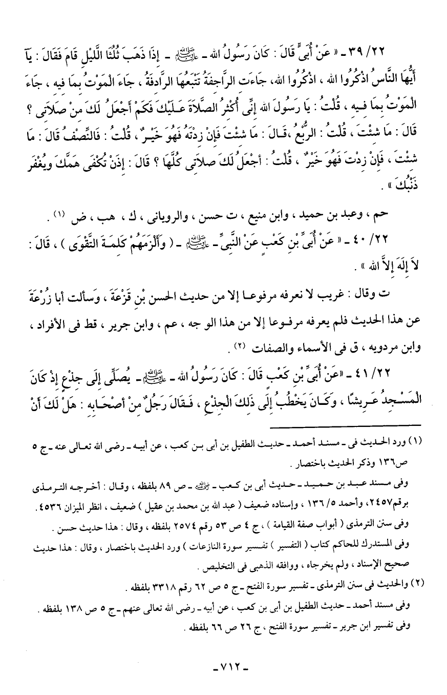 22/ 39 - "عَنْ أُبَىٍّ قَالَ: كَانَ رَسُولُ الله - صلى الله عليه وسلم - إِذَا ذَهَبَ ثُلُثَا الَّليْلِ قَامَ فَقَالَ: يَا أَيُّهَا النَّاسُ اذْكُرُوا الله، اذْكُرُوا الله، جَاءَتِ الرَّاجِفَةُ تَتْبَعُهَا الرَّادِفَةُ، جَاءَ الْمَوْتُ بِمَا فِيهِ، جَاءَ الْمَوْتُ بِمَا فِيهِ، قُلتُ: يَا رَسُولَ الله إِنِّى أُكْثِرُ الصَّلاَةَ عَلَيْكَ فَكَمْ أَجْعَلُ لَكَ مِنْ صَلاَتِى؟ قَالَ: مَا شِئْتَ، قُلتُ: الرُّبيِّع، قَالَ: مَا شِئْتَ فَإِنْ زِدْتَهُ فَهُوَ خَيْرٌ، قُلتُ: فَالنِّصْفُ قَالَ: مَا شِئْتَ، فَإِنْ زِدْتَ فَهُوَ خَيْرٌ، قُلتُ: أجْعَلُ لَكَ صلاَتِى كُلَّهَا؟ قَالَ: إِذَنْ تُكْفَى هَمَّكَ ويُغْفَر ذَنْبُكَ".