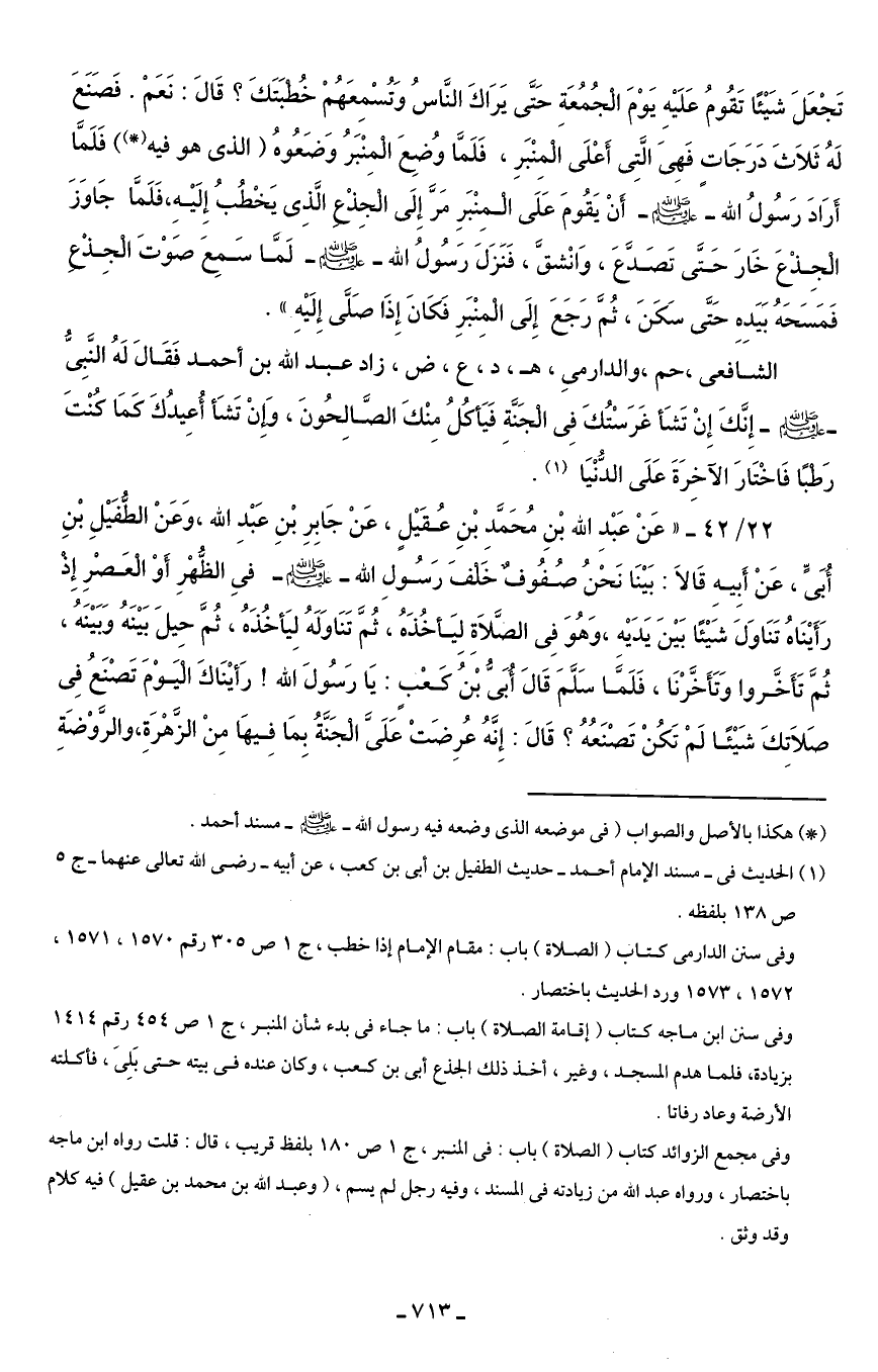 22/ 42 - "عَنْ عَبْدِ الله بْنِ مُحَمَّد بْنِ عُقَيْلٍ، عَنْ جَابِرِ بْنِ عَبْدِ الله، وَعَنْ الطُّفَيْلِ بْنِ أُبَىٍّ، عَنْ أَبِيهِ قَالاَ: بَيْنَا نَحْنُ صُفُوفٌ خَلْفَ رَسُولِ الله - صلى الله عليه وسلم - في الظُّهْرِ أَوْ الْعَصْرِ إِذْ رَأَيْنَاهُ تَنَاوَلَ شَيْئًا بَيْنَ يَدَيْه، وَهُوَ فِى الصَّلاَةِ لِيَأخُذَهُ، ثُمَّ تَنَاوَلَهُ لِيَأخُذَهُ، ثُمَّ حِيلَ بَيْنَهُ وَبَيْنَهُ، ثُمَّ تَأَخَّروا وَتَأَخَّرْنَا، فَلَمَّا سَلَّمَ قَالَ أُبَىُّ بْنُ كَعْبٍ: يَا رَسُولَ الله! رَأيْنَاكَ الْيَوْمَ تَصْنَعُ فِى صَلاَتكَ شَيْئًا لَمْ تَكُنْ تَصْنَعُهُ؟ قَالَ: إِنَّهُ عُرِضَتْ عَلَىَّ الْجَنَّةُ بِمَا فِيهَا مِنْ الزَّهْرَةِ، والرَّوْضَةِ