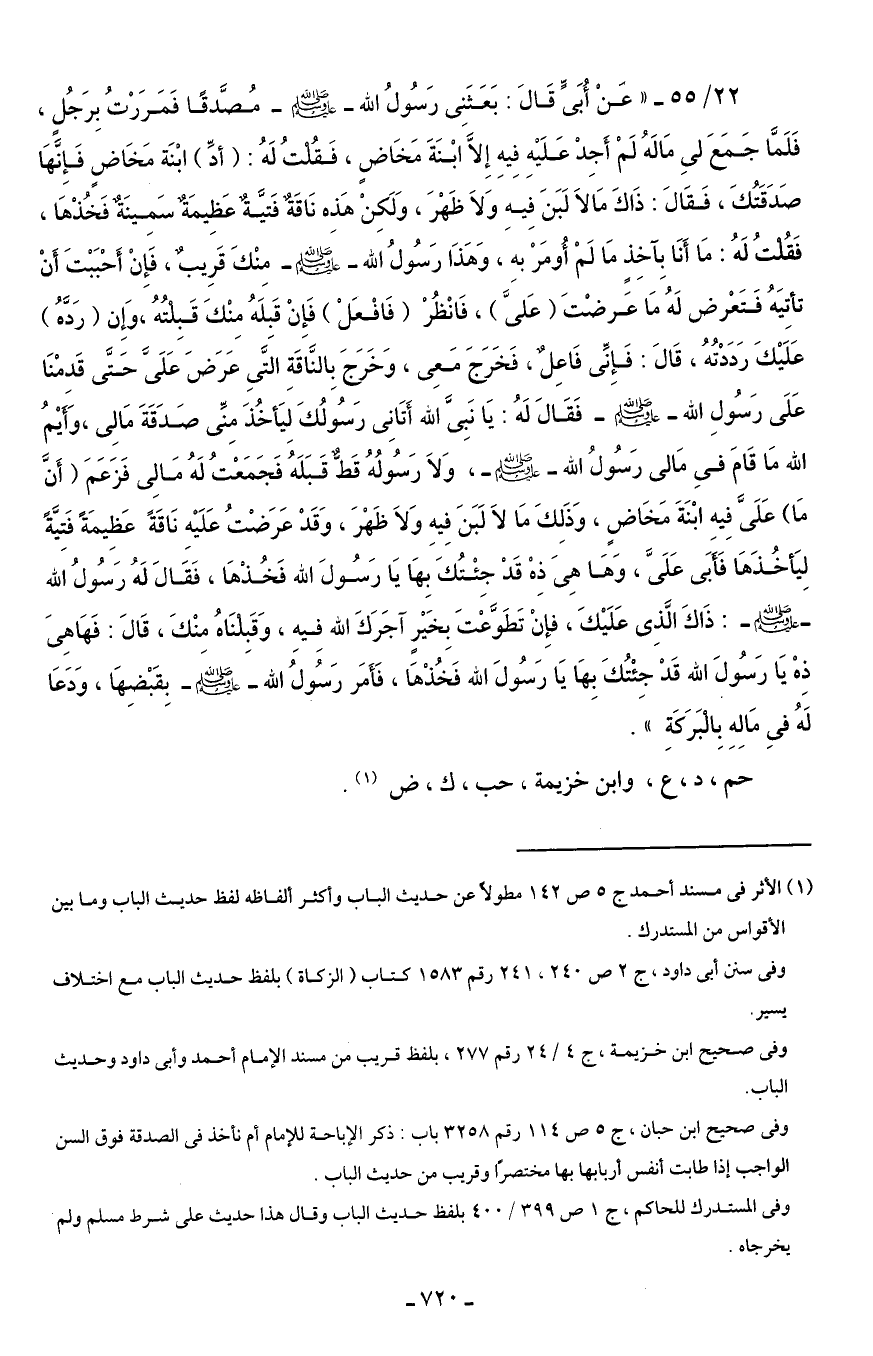22/ 55 - "عَنْ أُبَىٍّ قَالَ: بَعَثَنِي رَسُولُ الله - صلى الله عليه وسلم - مُصَّدقًا فَمَرَرْتُ بِرَجُلٍ، فَلَمَّا جَمَعَ لي مَالَهُ لَمْ أَجِدْ عَلَيْهِ فِيهِ إِلاَّ ابْنَةَ مَخَاضٍ، فَقُلْتُ لَهُ: (أدِّ) ابْنَة مَخَاضٍ فَإِنَّهَا صَدَقَتُكَ، فَقَالَ: ذَاكَ مَا لاَ لَبَنَ فِيهِ وَلاَ ظَهْرَ، وَلَكِنْ هَذِه نَاقَةٌ فَتيَّةٌ عَظِيمَةٌ سَمِينَةٌ فَخُذْهَا، فَقُلْتُ لَهُ: مَا أَنَا بِآخِذٍ مَا لَمْ أُومَرْ بهِ، وَهَذَا رَسُولُ الله - صلى الله عليه وسلم - مِنْكَ قَرِيبٌ، فَإِنْ أَحْبَبْتَ أَنْ تأتِيَهُ فَتَعْرض لَهُ مَا عَرضْتَ (عَلىَّ)، فَانْظُرْ (فَافْعَلْ) فَإِنْ قَبِلَهُ مِنْكَ قَبِلْتُهُ، وَإِن (رَدَّهُ) عَلَيْكَ رَدَدْتُهُ، قَالَ: فَإِنِّي فَاعِلٌ، فَخَرَجَ مَعِى، وَخَرَجَ بِالنَّاقَةِ التَّي عَرَضَ عَلَىَّ حَتَّى قَدِمْنَا عَلَى رَسُولِ الله - صلى الله عليه وسلم - فَقَالَ لَهُ: يَا نَبِىَّ الله أَتَانِي رَسُولُكَ لِيَأخُذَ مِنِّي صَدَقَةَ مَالِى، وَأَيْمُ الله مَا قَامَ في مَالى رَسُولُ الله - صلى الله عليه وسلم -، وَلاَ رَسُولُهُ قَطٌّ قَبَلَهُ فَجَمَعْتُ لَهُ مَالِى فَزَعَمَ (أَنَّ مَا) عَلَىَّ فِيهِ ابْنَةَ مَخَاضٍ، وَذَلِكَ مَا لاَ لَبَنَ فِيهِ وَلاَ ظَهْرَ، وَقَدْ عَرَضْتُ عَلَيْهِ نَاقَةً عَظِيمَةً فَتِيَّةً لِيَأخُذَهَا فَأَبَى عَلَىَّ، وَهَا هِىَ ذِهْ قَدْ جِئْتُكَ بِهَا يَا رَسُولَ الله فَخُذْهَا، فَقَالَ لَهُ رَسُولُ الله - صلى الله عليه وسلم -: ذَاكَ الَّذِي عَلَيْكَ، فإِنْ تَطَوَّعْتَ بِخَيْرٍ آجَرَكَ الله فِيهِ، وَقَبِلْنَاهُ مِنْكَ، قَالَ: فَهَا هِىَ ذِهْ يَا رَسُولَ الله قَدْ جِئْتُكَ بِهَا يَا رَسُولَ الله فَخُذْهَا، فَأَمَر رَسُولُ الله - صلى الله عليه وسلم - بِقَبْضِهَا، وَدَعَا لَهُ في مَالِهِ بِالْبَرَكَةِ".