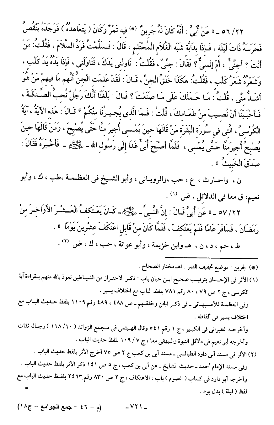 22/ 56 - "عَنْ أُبَىٍّ: أَنَّهُ كَانَ لَهُ جَرِينٌ (*) فِيهِ تَمْرٌ وَكَانَ (يَتعَاهدُهُ) فَوَجَدَهُ يَنْقُصُ فَحَرَسَهُ ذَاتَ لَيْلَةٍ، فَإِذَا بِدَابَّةٍ شَبَه الْغُلاَمِ الْمُحْتَلِمِ، قَالَ: فَسَلَّمْتُ فَرَدَّ السَّلاَمَ، فَقُلْتُ: مَنْ أَنْتَ؟ أَجِنِّىٌّ، أَمْ إنْسِىٌّ؟ فَقَالَ: جِنِّىٌ، فَقُلْتُ: نَاوِلْنِي يَدَكَ، فَنَاوَلَنِي، فَإِذَا يَدُهُ يَدُ كَلْبٍ، وَشَعْرُهُ شَعْرُ كَلْبٍ، فَقُلْتُ: هَكَذَا خَلْقُ الْجِنِّ، قَالَ: لَقَدْ عَلِمَتِ الْجِنُّ أَنَّهم مَا فِيهِمْ مَنْ هُوَ أَشَدُّ مِنِّي، قُلْتُ: مَا حَمَلَكَ عَلَى مَا صَنَعْتَ؟ قَالَ: بَلَغَنَا أَنَّكَ رَجُلٌ تُحِبُّ الصَّدَقَةَ، فَأَحْبَبْنَا أَنْ نُصِيبَ مِنْ طَعَامِكَ، قُلْتُ: فَمَا الَّذِي يُجيرُنَا مِنْكُمْ؟ قَالَ: هَذِهِ الآيَةُ، آيَةُ الْكُرْسِىِّ، الَّتِى في سُورَةِ الْبَقَرَةِ مَنْ قَالَهَا حِينَ يُمْسِى أُجِيرَ مِنَّا حَتَّى يُصْبِحَ، وَمَنْ قَالَهَا حِينَ يُصْبِحُ أُجِيرَ مِنَّا حَتَّى يُمْسِى، فَلَمَّا أَصْبَحَ أُبَىٌّ غَدَا إِلَى رَسُولِ الله - صلى الله عليه وسلم - فَأَخْبَرَهُ فَقَالَ: صَدَقَ الْخَبِيثُ".