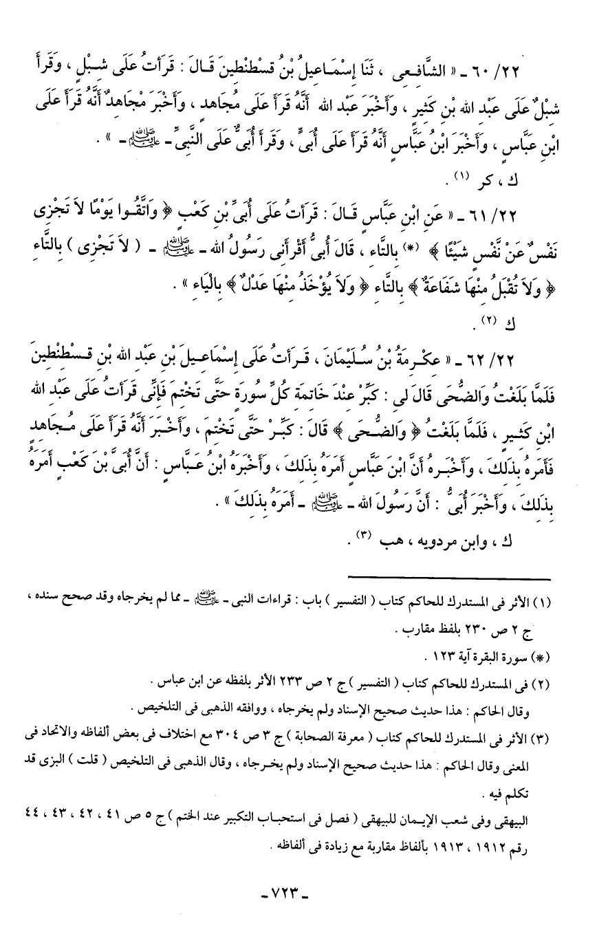 22/ 61 - "عَنِ ابْنِ عَبَّاسٍ قَالَ: قَرَأتُ عَلَى أُبَىِّ بْنِ كَعْبٍ {وَاتَّقُوا يَوْمًا لَا تَجْزِي نَفْسٌ عَنْ نَفْسٍ شَيْئًا} (*) بِالتَّاءِ، قَالَ أُبىُّ أَقْرأَنِي رَسُولُ الله - صلى الله عليه وسلم - (لاَ تَجْزِى) بِالتَّاءِ {وَلَا يُقْبَلُ مِنْهَا شَفَاعَةٌ} بِالتَّاءِ {وَلَا يُؤْخَذُ مِنْهَا عَدْلٌ} بِالْيَاءِ".