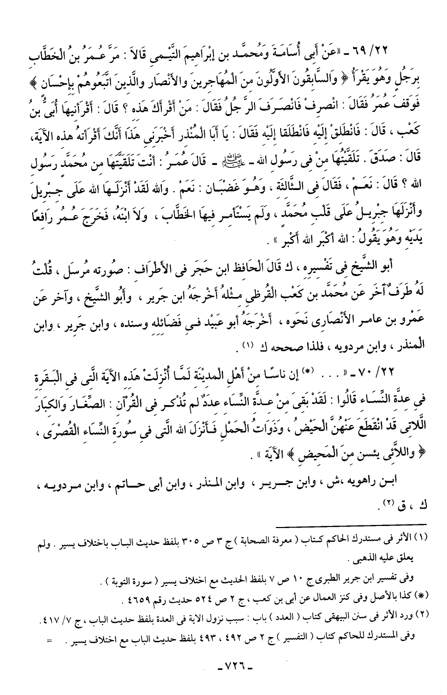 22/ 69 - "عَنْ أَبِى أُسَامَةَ وَمُحمَّد بن إبْرَاهِيمَ التَّيْمي قَالاَ: مَرَّ عُمَرُ بنُ الْخَطَّابِ بِرَجُلٍ وَهُوَ يَقْرَأُ {وَالسَّابِقُونَ الْأَوَّلُونَ مِنَ الْمُهَاجِرِينَ وَالْأَنْصَارِ وَالَّذِينَ اتَّبَعُوهُمْ بِإِحْسَانٍ} فَوَقفَ عُمَرُ فَقَالَ: انْصرِفْ فَانْصَرَفَ الرَّجُلُ فَقَالَ: مَنْ أَقْرأَكَ هَذِهِ؟ قَالَ: أَقْرَأنِيهَا أُبَىُّ بنُ كَعْب، قَالَ: فَانْطَلِقْ إِلَيْهِ فَانْطَلَقا إِلَيْهِ فَقَالَ: يَا أَبَا الْمُنْذِر أَخْبَرَنِيِ هَذَا أَنَّكَ أَقْرَأتهُ هذِه الآيَة، قَالَ: صَدَقَ. تَلَقَّيْتُهَا مِنْ فِي رَسُولِ الله - صلى الله عليه وسلم - قَالَ عُمَرُ: أنْتَ تَلَقَيَّتَهَا مِن مُحَمَّدٍ رَسُولِ الله؟ قَالَ: نَعَمْ، فَقَالَ فِي الثَّالِثَةِ، وَهُوَ غَضْبَان: نَعَمْ. وَالله لَقَدْ أَنْزَلَهَا الله عَلَى جِبْرِيلَ وأَنْزَلَهَا جِبْرِيلُ عَلَى قَلْبِ مُحَمَّدٍ، وَلَم يَسْتَأمِر فِيهَا الخَطَّابَ، وَلَا ابْنَهُ، فَخَرَجَ عُمُر رَافِعًا يَدَيْهِ وَهُوَ يَقُولُ: الله أكْبَر الله أَكْبر".