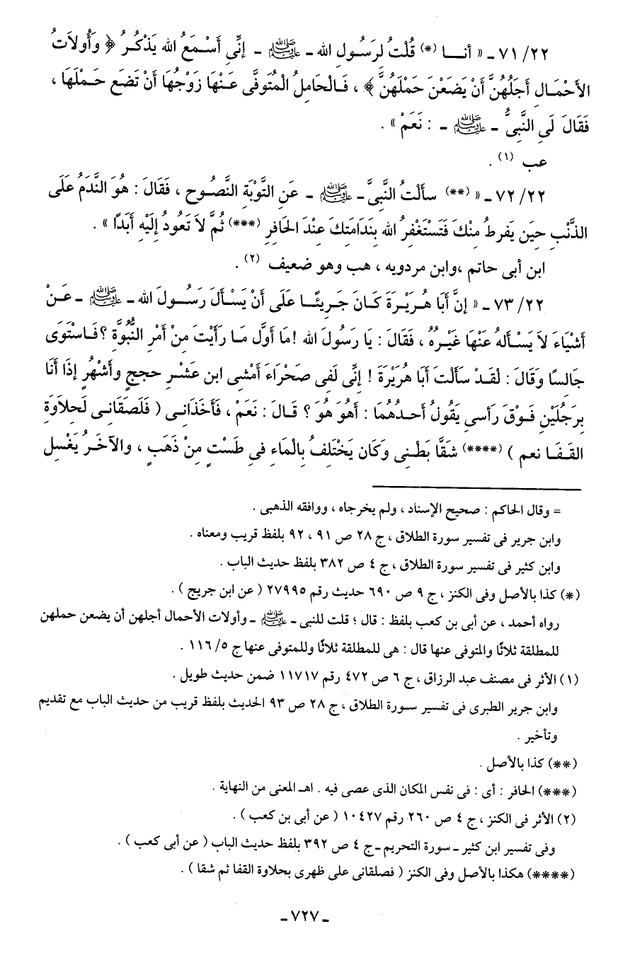 22/ 72 - " (* *) سأَلْتُ النَّبِىَّ - صلى الله عليه وسلم - عَنِ التَّوْبَةِ النَّصُوح، فَقَالَ: هُوَ النَّدَمُ عَلَى الذَّنْبِ حِيَن يَفرطُ مِنْكَ فَتَسْتَغْفِرُ الله بِنَدَامَتِكَ عِنْدَ الحَافِرِ (* * *) ثُمَّ لاَ تَعُودُ إِلَيْهِ أَبَدًا".